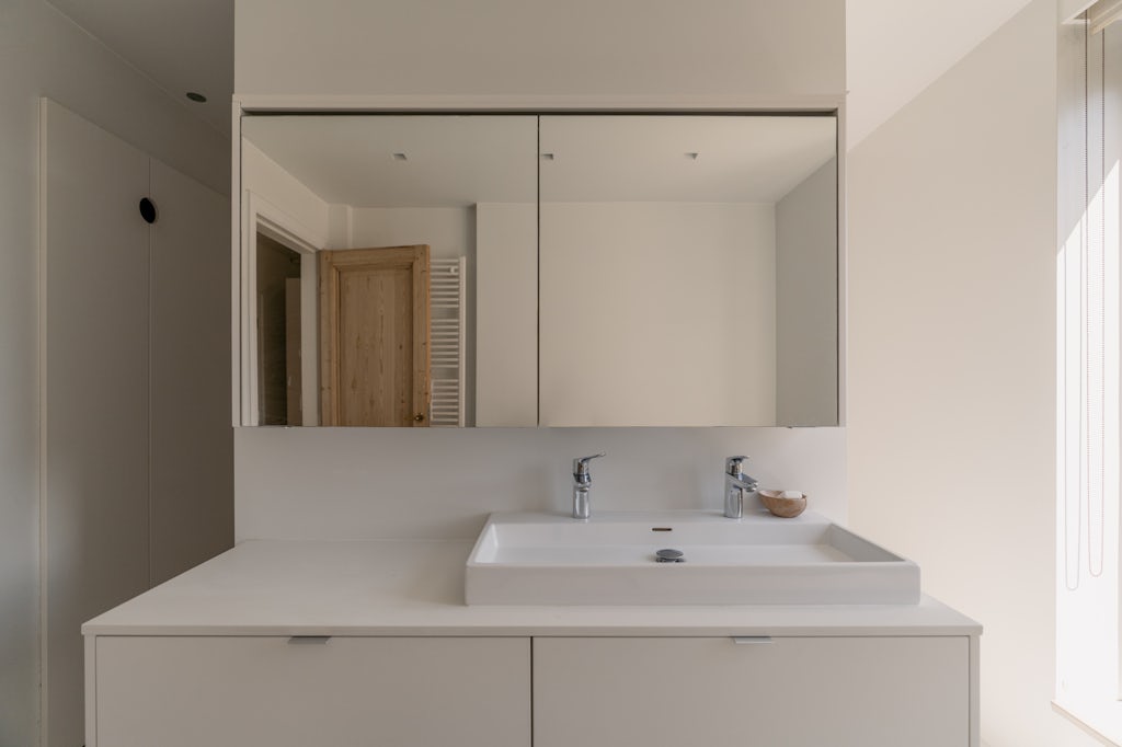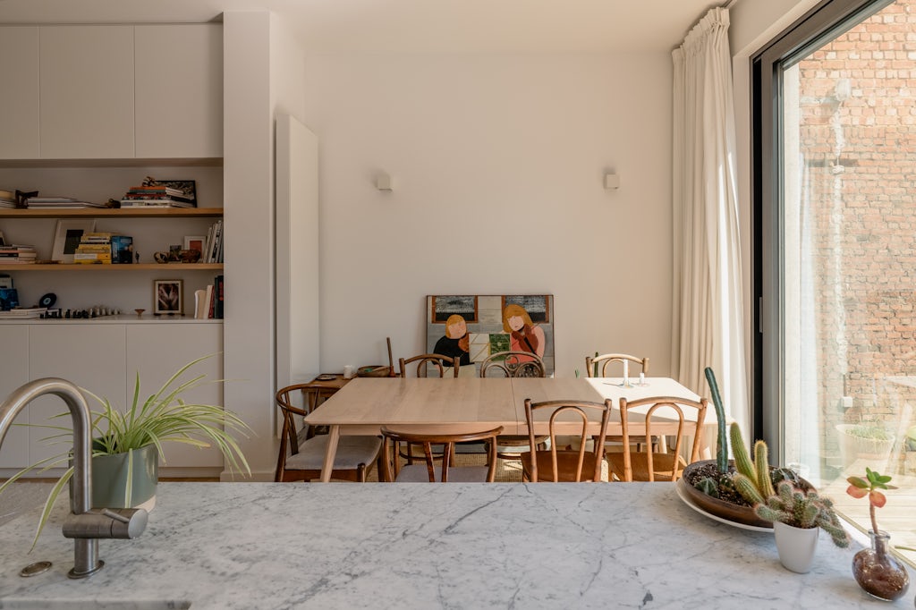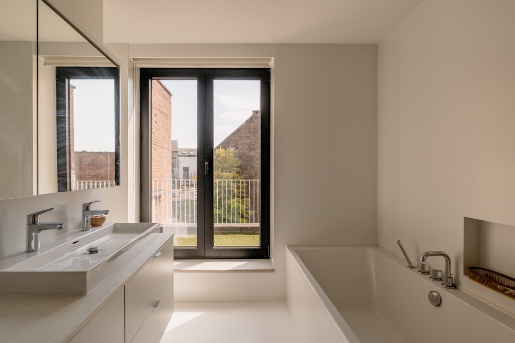 Een appartement dat aanvoelt als een woning, zo kunnen we deze gerenoveerde parel het beste omschrijven. Verdeeld over 3 etages met de inkomdeur op de 1ste verdieping. Volledig gerenoveerd met respect voor de authentieke elementen én volgens de nieuwste kwaliteitsnormen. Zo zijn de voor- en achtergevel volledig geïsoleerd. Die laatste is helemaal opnieuw opgetrokken en geeft via een groot schuifraam toegang naar het zuidgeoriënteerd terras. Hier achteraan bevindt zich de open keuken zodat buiten eten een evidentie wordt en je van een mooie natuurlijke lichtinval geniet tijdens het koken. Het keukeneiland is uitgevoerd in Carrera marmer en de keuken is uitgerust met veel kasten, een design kookplaat op gas met 5 pitten (Smeg), een koelkast met biofresh lades (Liebherr), een oven (AEG) en een vaatwasser (Bosch). De leefruimte op volle eiken parket heeft hoge plafonds en een praktische ingemaakte bibliotheekkast. Een verdieping hoger bevinden zich een 1steslaapkamer en de badkamer. Opnieuw zeer licht, luchtig en met een aansluitend terras. Zo geniet je vanuit het bad of de douche van groen (kunst)gras. In een ingemaakt kast kan je de was- en droogmachine instaleren. Het toilet bevindt zich apart, ideaal voor gasten dus. Op de bovenste verdieping zijn er nog eens 2 slaapkamers. Eén van deze kamers kan ook gebruik worden als home office, er is opnieuw een toilet. De andere kamer heeft dan weer een handige extra lavabo. Ze zijn ook allebei uitgerust met kasten en de ramen hebben rolluiken (lekker lang uitslapen). De kelder kan je gebruiken om eventueel een diepvriezer te plaatsen. De gemene kosten bedragen 50 euro en zijn een provisie voor de blokpolis.