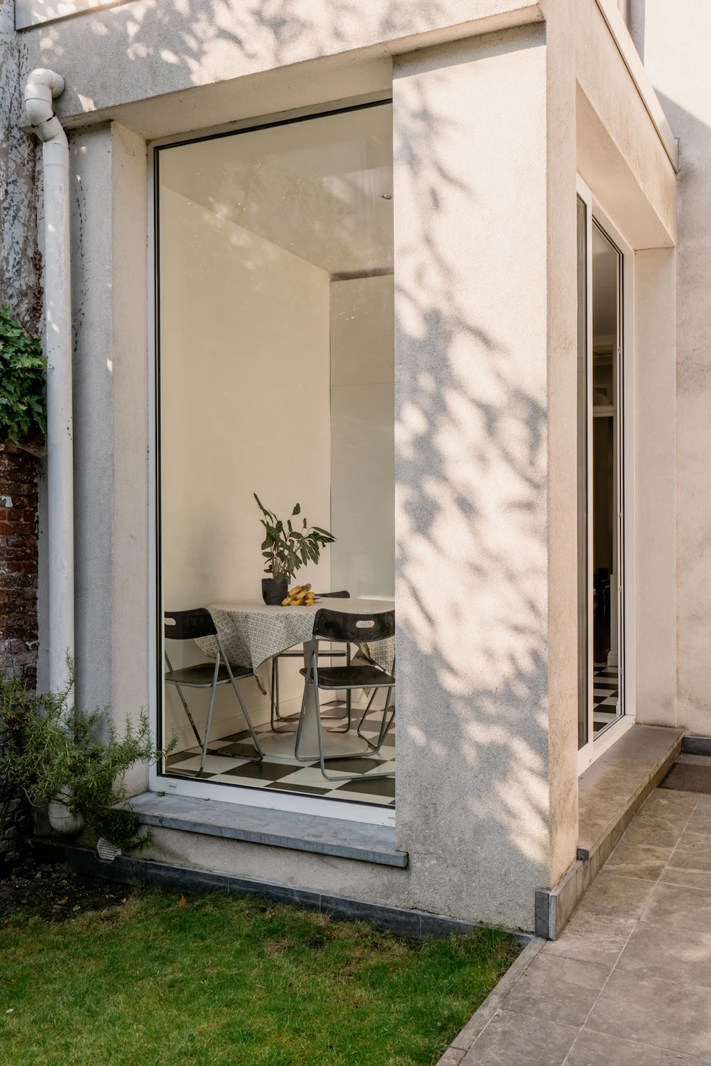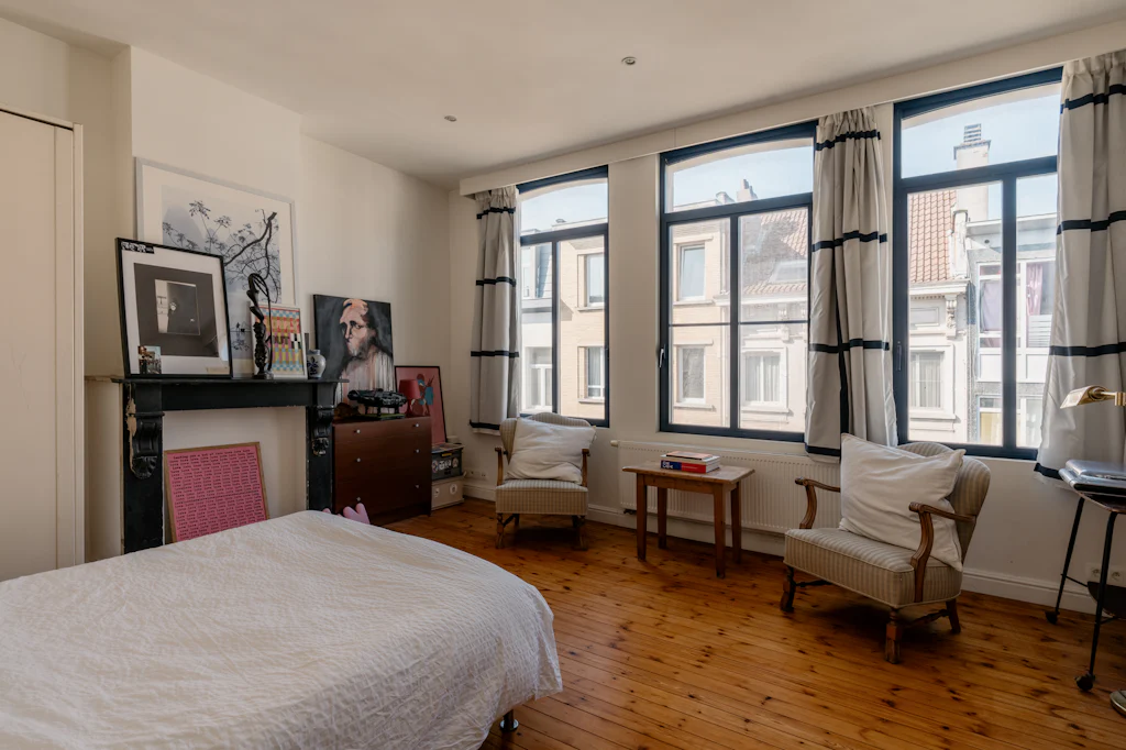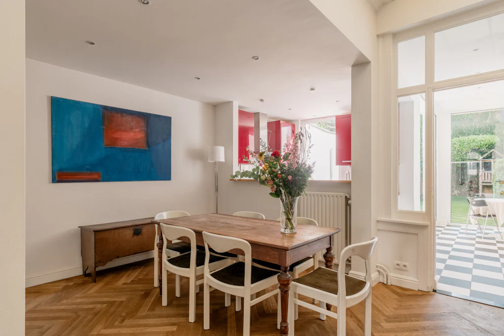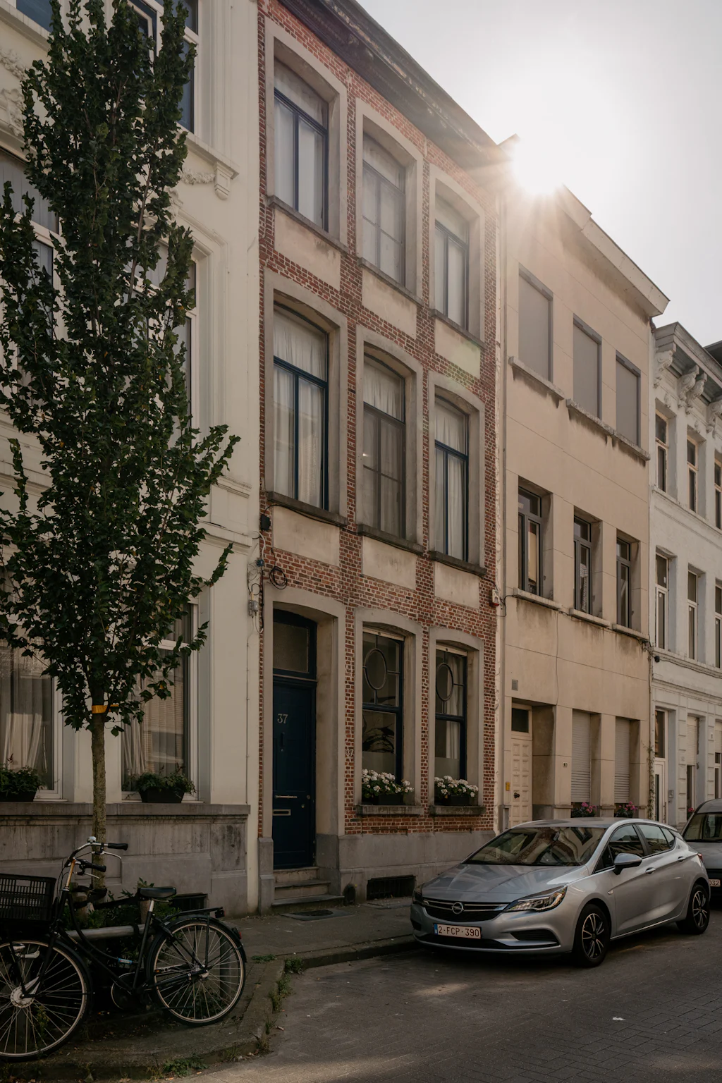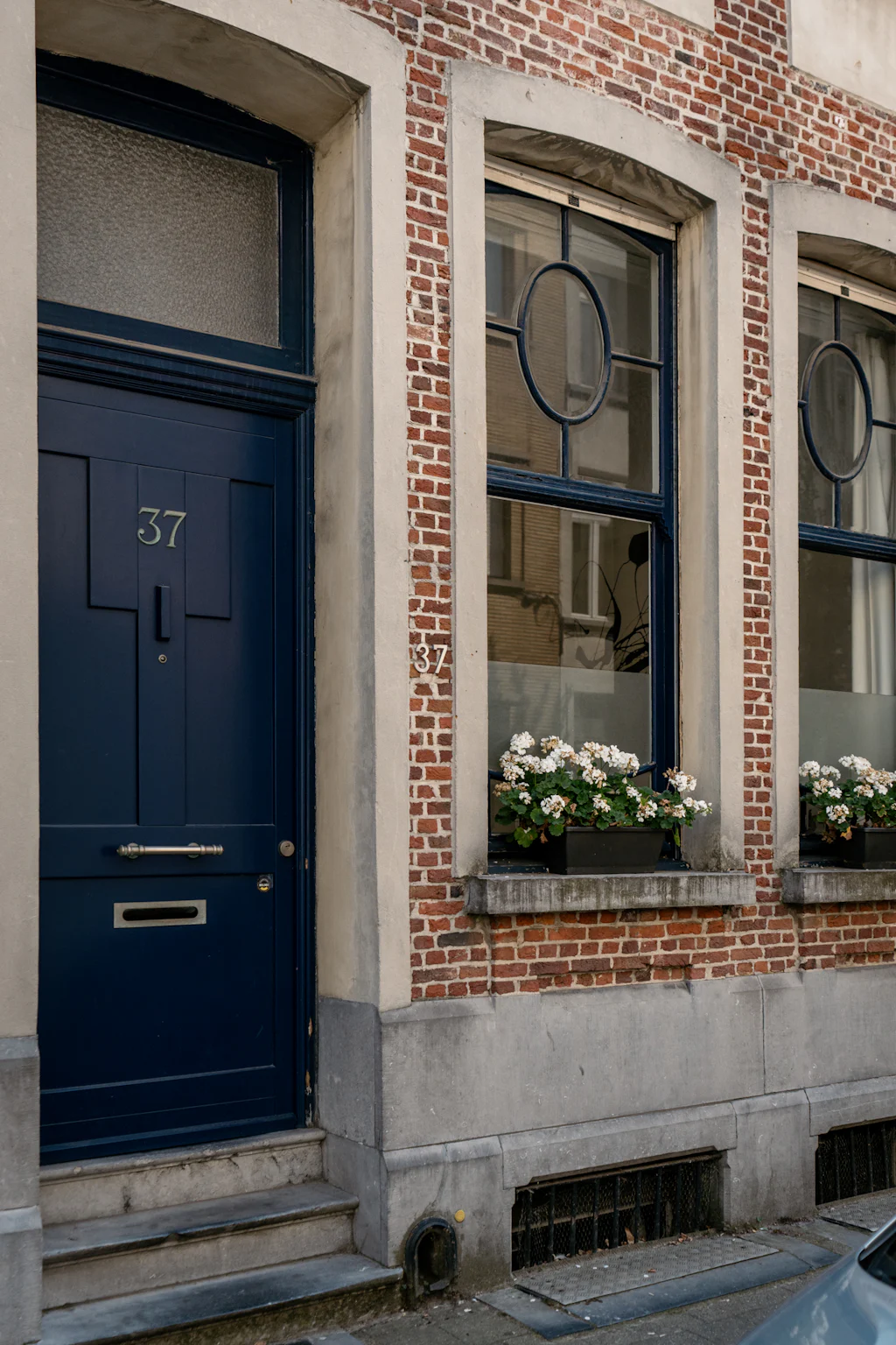 De blauwe deur en witte geraniums aan het raam maken ons benieuwd naar wat er zich achter de bakstenen voorgevel van de woning in de Greinstraat schuilhoudt. Dat blijkt de moeite te zijn. Wij kunnen de ‘greins’ niet van ons gezicht halen bij het ziens van zoveel mooie details: dansende ooievaars, mozaïek vloeren, naakte engelen, deuren met okergeel glas en cassettenplafonds. Ze zijn een kenmerkende herinnering aan de organische art nouveau architectuur uit de belle époque (het huis werd gebouwd in 1923). Het blijkt daarenboven de perfecte gezinswoning te zijn dankzij de 4 slaapkamers, een extra bureaukamer, 2 badkamers en een schommel in de groene tuin van 90 m². De keuken heeft een Boretti gasfornuis met 6 pitten en een ietwat aparte ontbijthoek. Die staat garant voor koffie drinken met zicht op de tuin. En voor uitgebreide diners neem je plaats in de aansluitende eetkamer. Wij houden ook van de dynamiek van de verschillende vertrekken. Die is anders dan bij de meeste herenwoningen waarbij de keuken, eetkamer en leefruimte zich doorgaans achter elkaar bevinden. In deze woning zijn het meer verschillende cosy corners die discreet in elkaar overlopen. Dit komt ook terug bij de badkamer. De eerste badkamer bestaat uit 2 delen waarvan één ideaal dienst kan doen als laundry room. De andere badkamer bevindt zich naast een kamer die heel geschikt is om gasten te ontvangen. En ze heeft een prachtig uitzicht op de seventies boom in de tuin van de buren. Elke verdieping beschikt over een apart toilet. Tot slot heeft de woning een kelder. De auto parkeerden de verkopers in een overdekte garage in de straat waarvan de huurovereenkomst kan overgenomen worden.