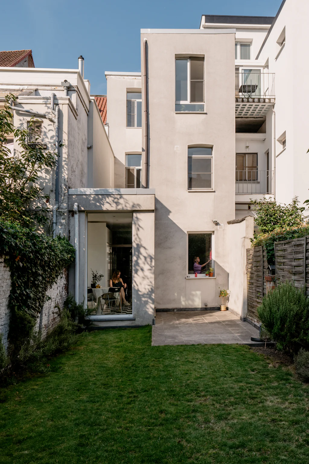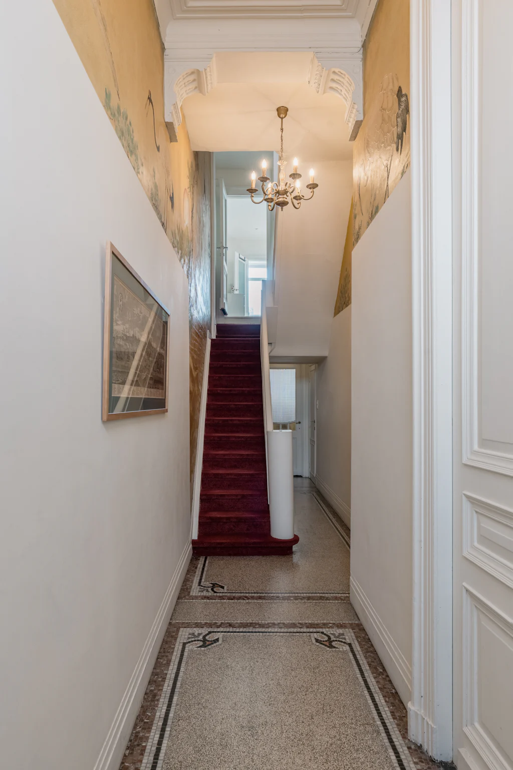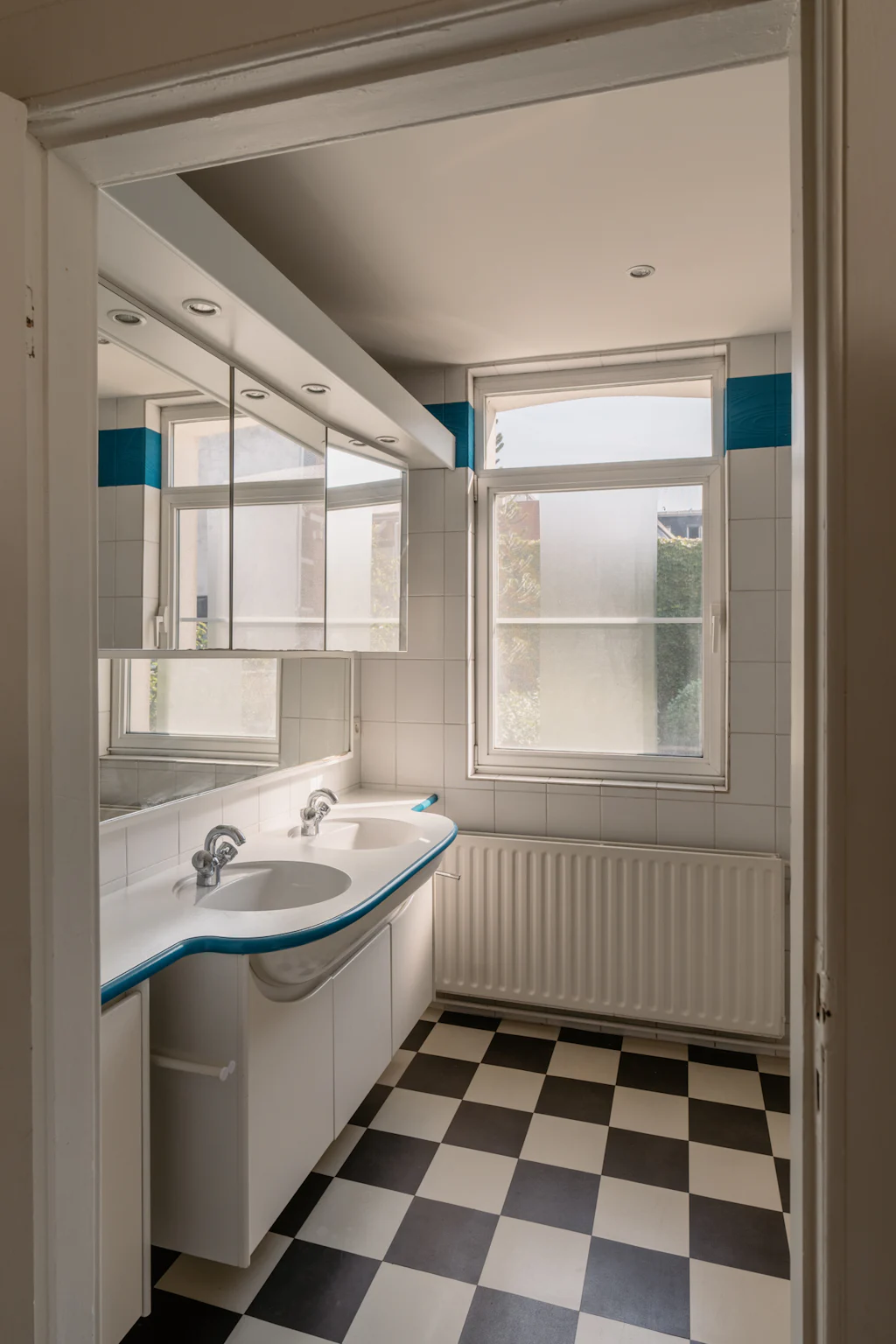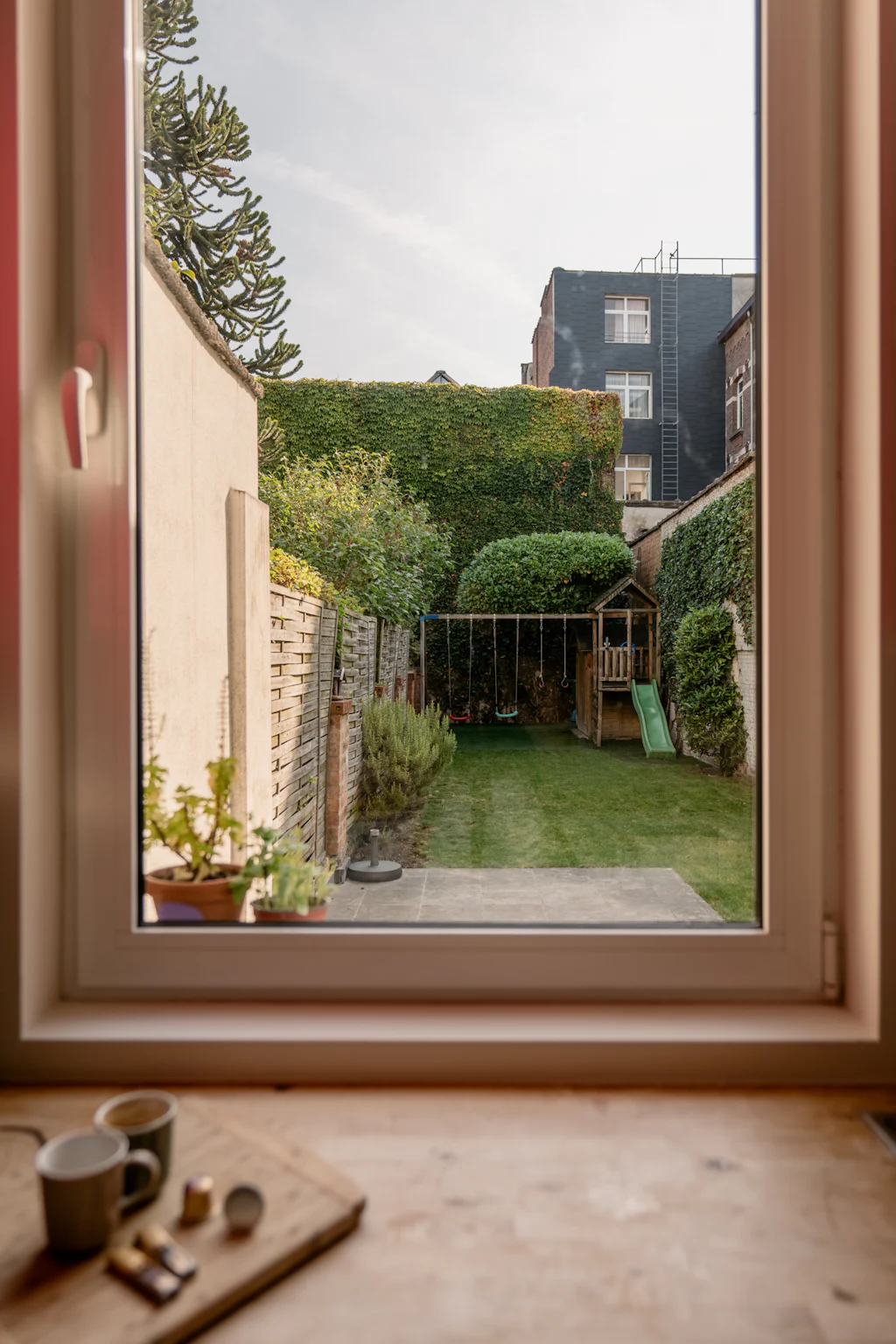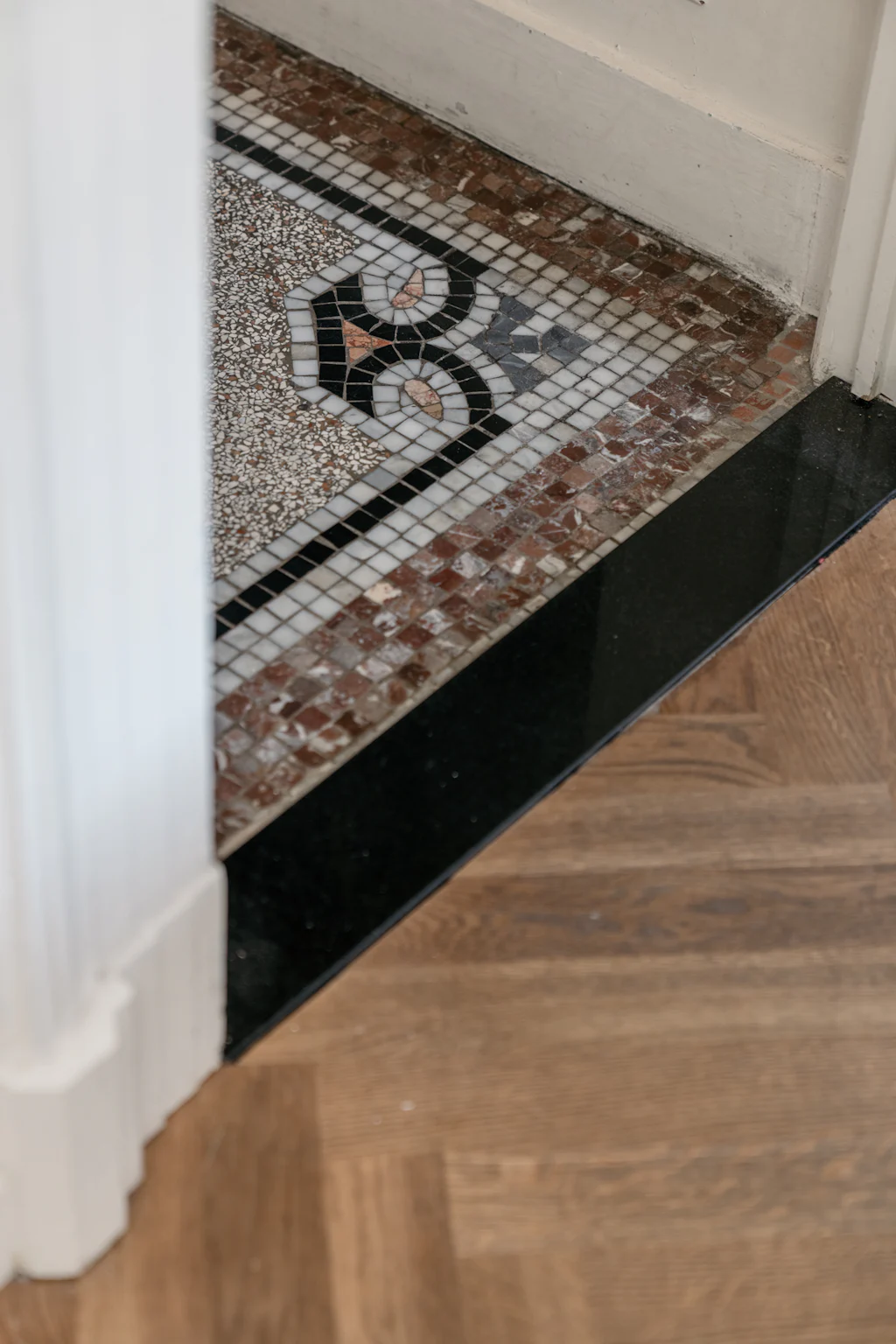 De blauwe deur en witte geraniums aan het raam maken ons benieuwd naar wat er zich achter de bakstenen voorgevel van de woning in de Greinstraat schuilhoudt. Dat blijkt de moeite te zijn. Wij kunnen de ‘greins’ niet van ons gezicht halen bij het ziens van zoveel mooie details: dansende ooievaars, mozaïek vloeren, naakte engelen, deuren met okergeel glas en cassettenplafonds. Ze zijn een kenmerkende herinnering aan de organische art nouveau architectuur uit de belle époque (het huis werd gebouwd in 1923). Het blijkt daarenboven de perfecte gezinswoning te zijn dankzij de 4 slaapkamers, een extra bureaukamer, 2 badkamers en een schommel in de groene tuin van 90 m². De keuken heeft een Boretti gasfornuis met 6 pitten en een ietwat aparte ontbijthoek. Die staat garant voor koffie drinken met zicht op de tuin. En voor uitgebreide diners neem je plaats in de aansluitende eetkamer. Wij houden ook van de dynamiek van de verschillende vertrekken. Die is anders dan bij de meeste herenwoningen waarbij de keuken, eetkamer en leefruimte zich doorgaans achter elkaar bevinden. In deze woning zijn het meer verschillende cosy corners die discreet in elkaar overlopen. Dit komt ook terug bij de badkamer. De eerste badkamer bestaat uit 2 delen waarvan één ideaal dienst kan doen als laundry room. De andere badkamer bevindt zich naast een kamer die heel geschikt is om gasten te ontvangen. En ze heeft een prachtig uitzicht op de seventies boom in de tuin van de buren. Elke verdieping beschikt over een apart toilet. Tot slot heeft de woning een kelder. De auto parkeerden de verkopers in een overdekte garage in de straat waarvan de huurovereenkomst kan overgenomen worden.