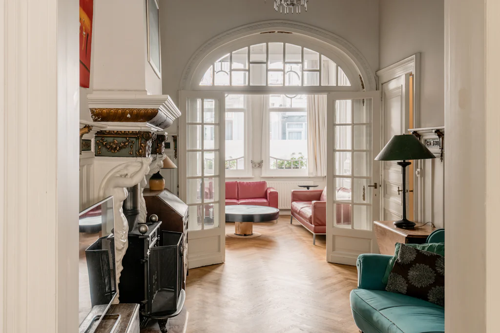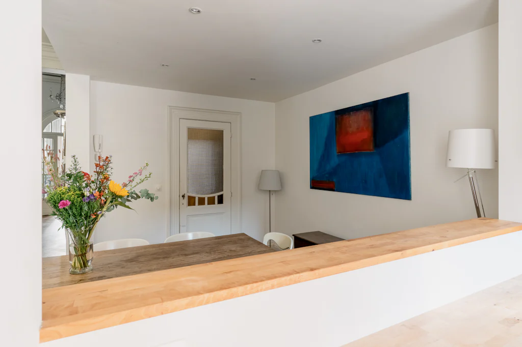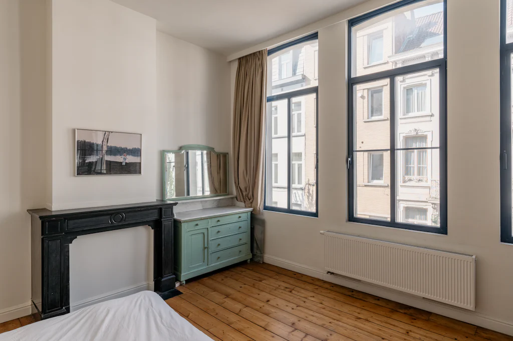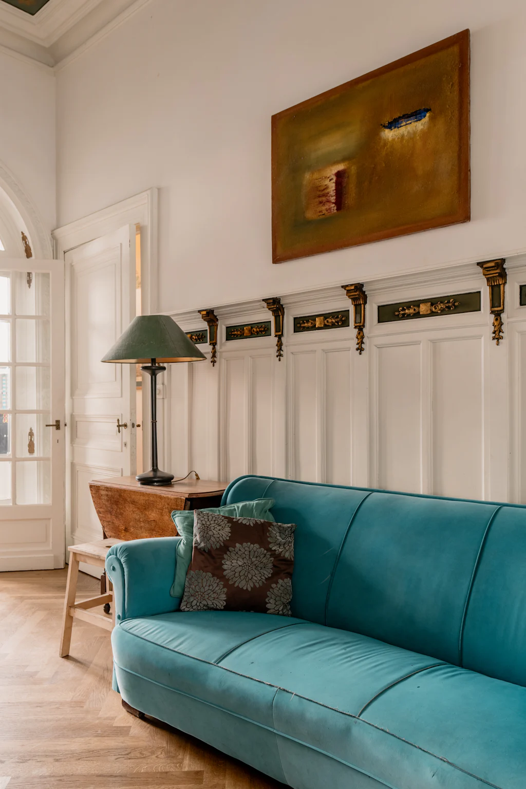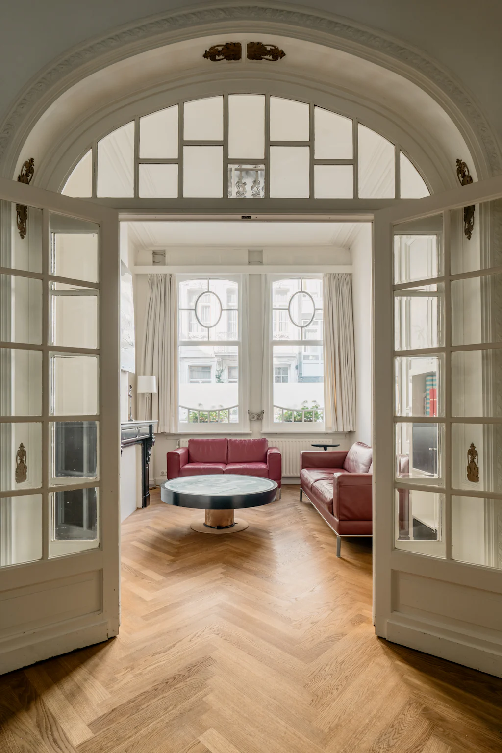 De blauwe deur en witte geraniums aan het raam maken ons benieuwd naar wat er zich achter de bakstenen voorgevel van de woning in de Greinstraat schuilhoudt. Dat blijkt de moeite te zijn. Wij kunnen de ‘greins’ niet van ons gezicht halen bij het ziens van zoveel mooie details: dansende ooievaars, mozaïek vloeren, naakte engelen, deuren met okergeel glas en cassettenplafonds. Ze zijn een kenmerkende herinnering aan de organische art nouveau architectuur uit de belle époque (het huis werd gebouwd in 1923). Het blijkt daarenboven de perfecte gezinswoning te zijn dankzij de 4 slaapkamers, een extra bureaukamer, 2 badkamers en een schommel in de groene tuin van 90 m². De keuken heeft een Boretti gasfornuis met 6 pitten en een ietwat aparte ontbijthoek. Die staat garant voor koffie drinken met zicht op de tuin. En voor uitgebreide diners neem je plaats in de aansluitende eetkamer. Wij houden ook van de dynamiek van de verschillende vertrekken. Die is anders dan bij de meeste herenwoningen waarbij de keuken, eetkamer en leefruimte zich doorgaans achter elkaar bevinden. In deze woning zijn het meer verschillende cosy corners die discreet in elkaar overlopen. Dit komt ook terug bij de badkamer. De eerste badkamer bestaat uit 2 delen waarvan één ideaal dienst kan doen als laundry room. De andere badkamer bevindt zich naast een kamer die heel geschikt is om gasten te ontvangen. En ze heeft een prachtig uitzicht op de seventies boom in de tuin van de buren. Elke verdieping beschikt over een apart toilet. Tot slot heeft de woning een kelder. De auto parkeerden de verkopers in een overdekte garage in de straat waarvan de huurovereenkomst kan overgenomen worden.