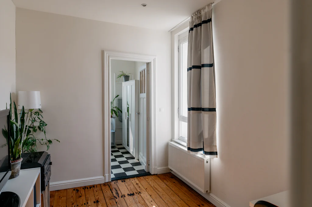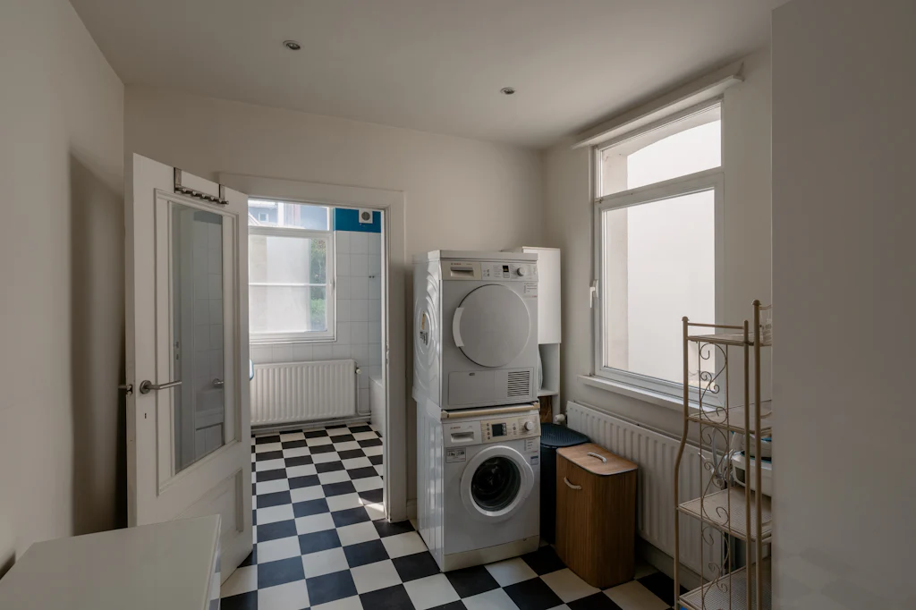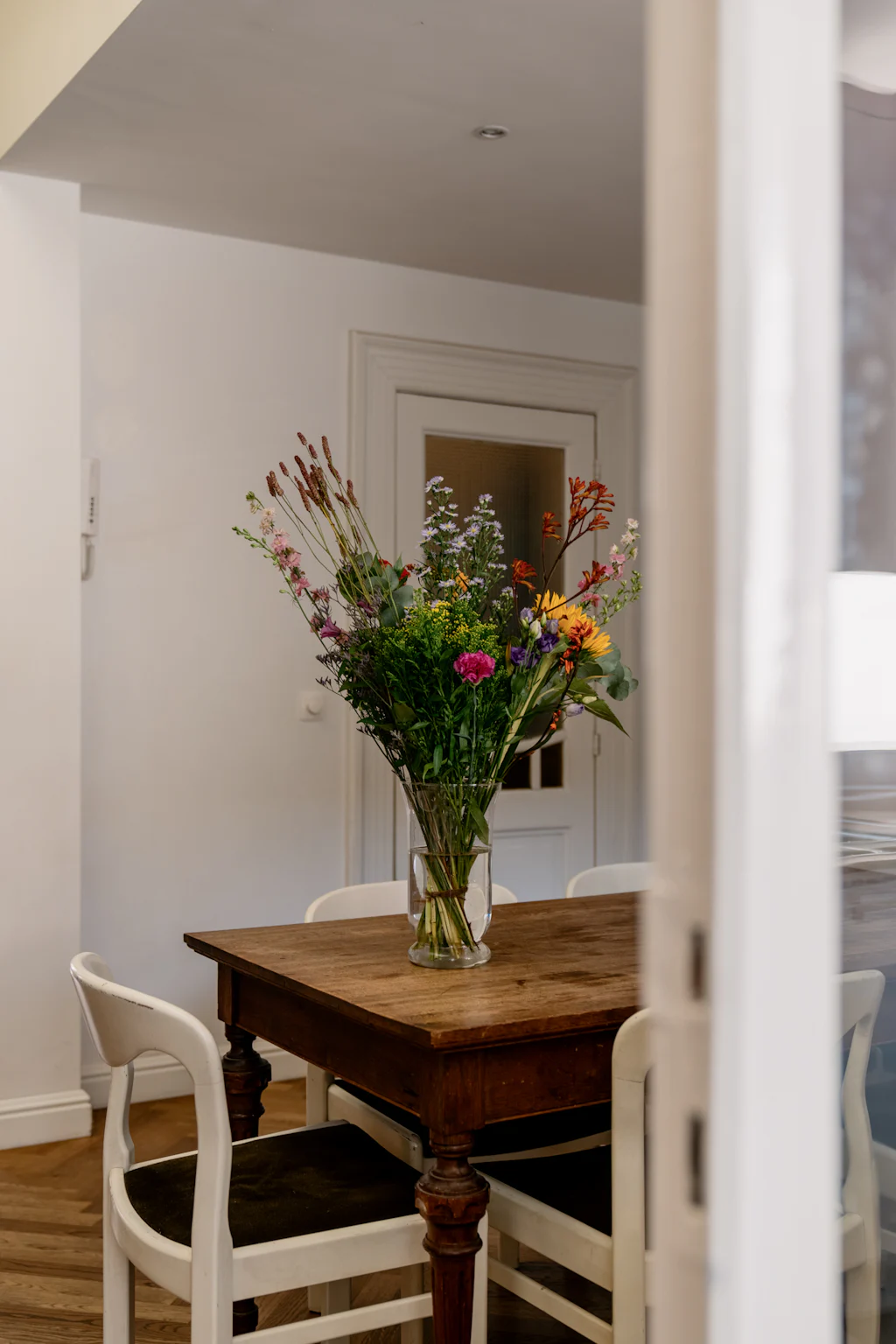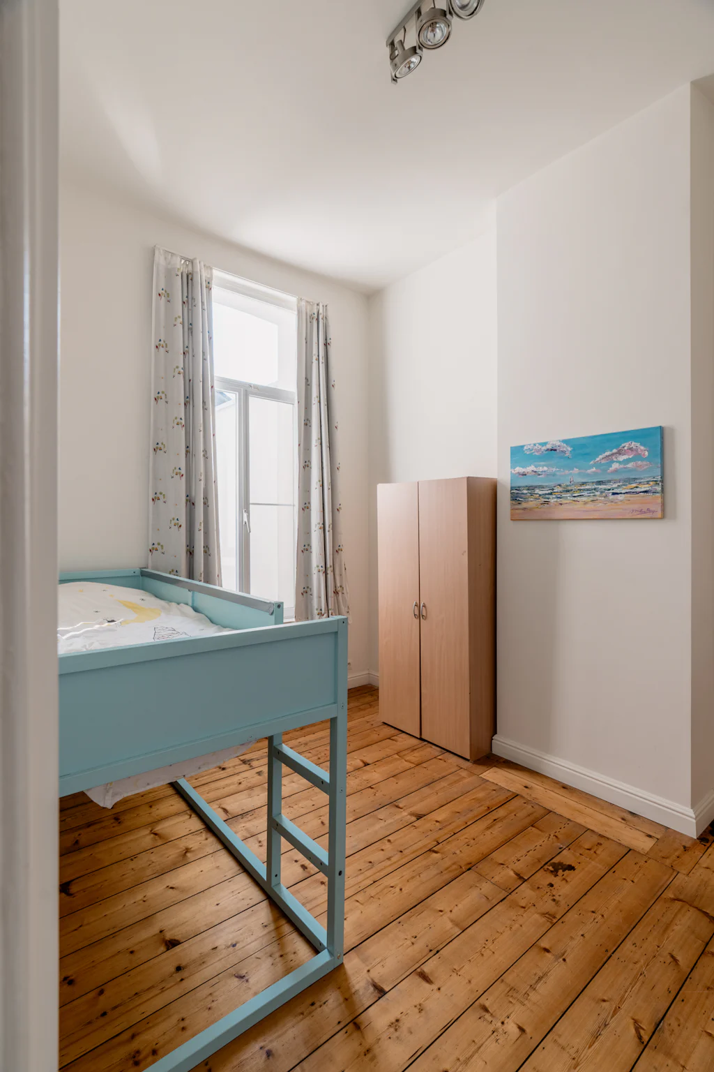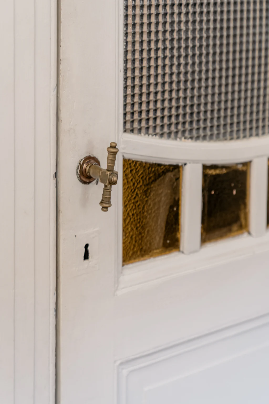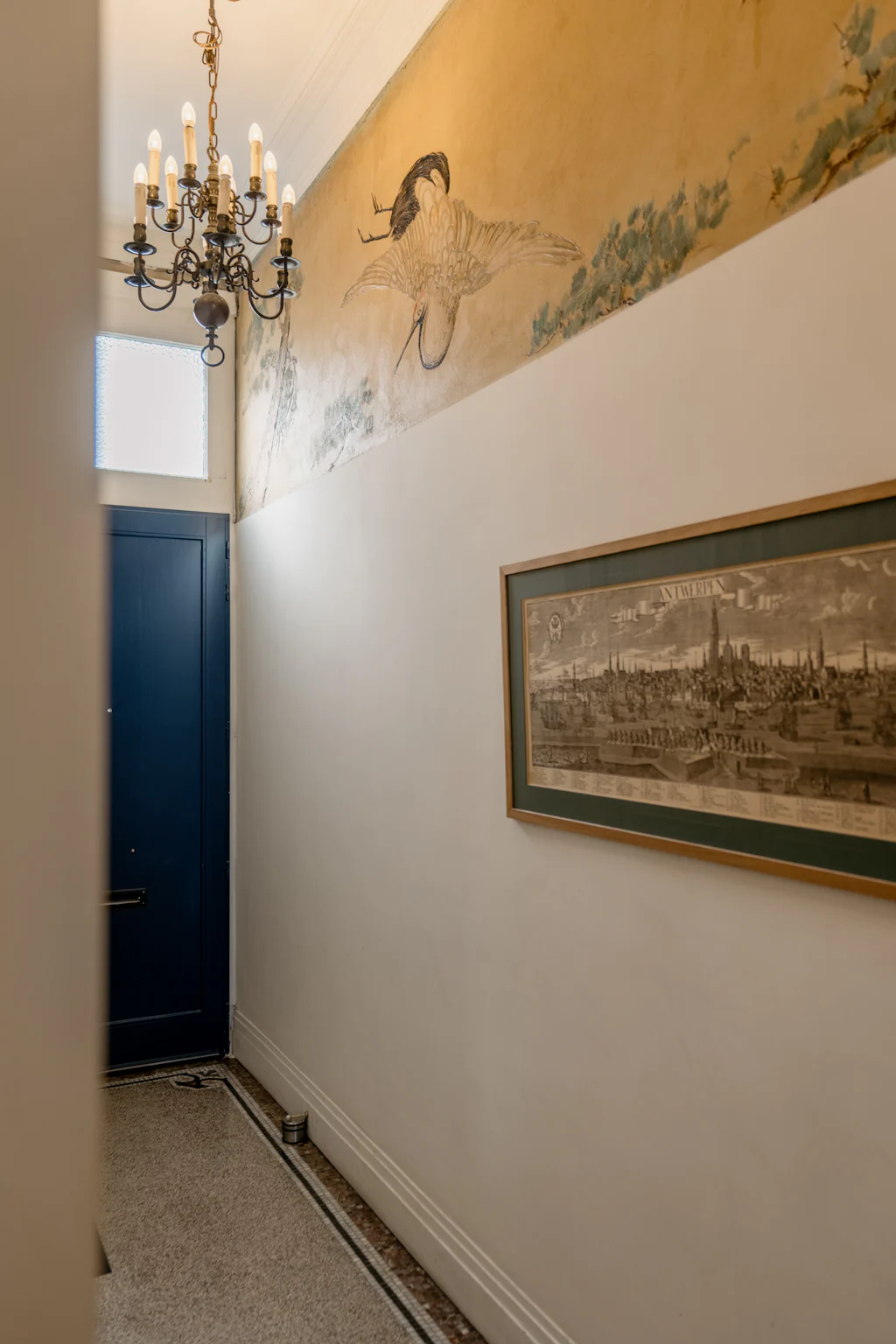 De blauwe deur en witte geraniums aan het raam maken ons benieuwd naar wat er zich achter de bakstenen voorgevel van de woning in de Greinstraat schuilhoudt. Dat blijkt de moeite te zijn. Wij kunnen de ‘greins’ niet van ons gezicht halen bij het ziens van zoveel mooie details: dansende ooievaars, mozaïek vloeren, naakte engelen, deuren met okergeel glas en cassettenplafonds. Ze zijn een kenmerkende herinnering aan de organische art nouveau architectuur uit de belle époque (het huis werd gebouwd in 1923). Het blijkt daarenboven de perfecte gezinswoning te zijn dankzij de 4 slaapkamers, een extra bureaukamer, 2 badkamers en een schommel in de groene tuin van 90 m². De keuken heeft een Boretti gasfornuis met 6 pitten en een ietwat aparte ontbijthoek. Die staat garant voor koffie drinken met zicht op de tuin. En voor uitgebreide diners neem je plaats in de aansluitende eetkamer. Wij houden ook van de dynamiek van de verschillende vertrekken. Die is anders dan bij de meeste herenwoningen waarbij de keuken, eetkamer en leefruimte zich doorgaans achter elkaar bevinden. In deze woning zijn het meer verschillende cosy corners die discreet in elkaar overlopen. Dit komt ook terug bij de badkamer. De eerste badkamer bestaat uit 2 delen waarvan één ideaal dienst kan doen als laundry room. De andere badkamer bevindt zich naast een kamer die heel geschikt is om gasten te ontvangen. En ze heeft een prachtig uitzicht op de seventies boom in de tuin van de buren. Elke verdieping beschikt over een apart toilet. Tot slot heeft de woning een kelder. De auto parkeerden de verkopers in een overdekte garage in de straat waarvan de huurovereenkomst kan overgenomen worden.