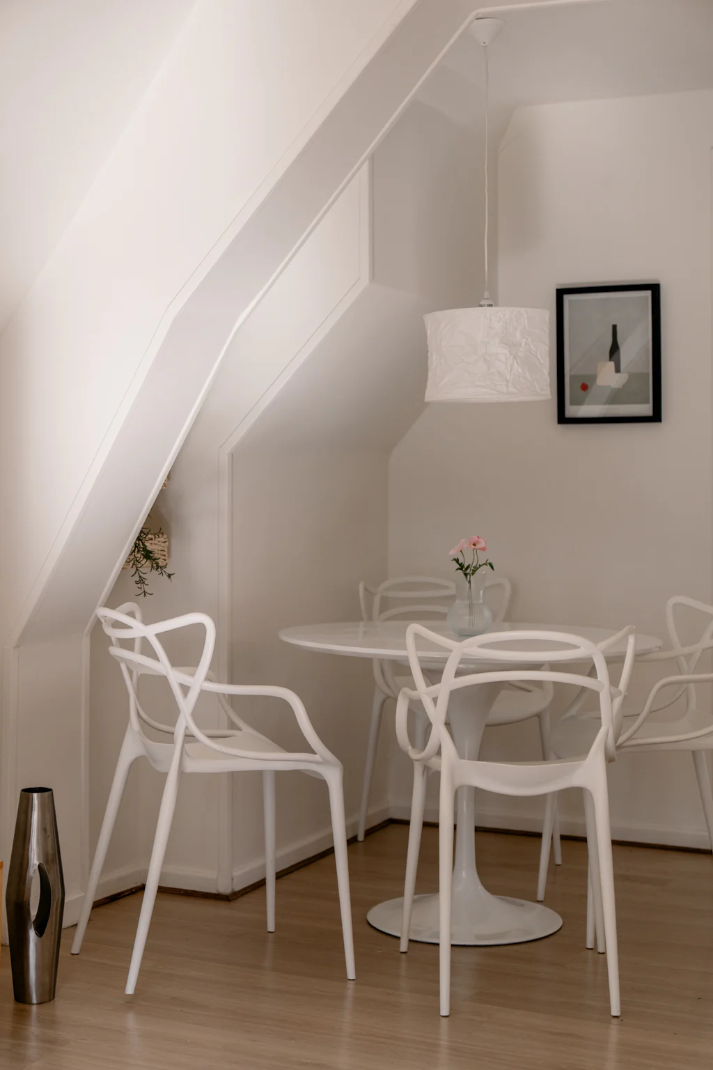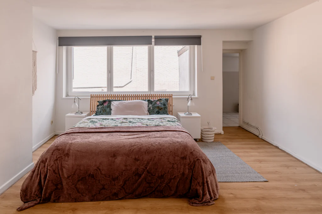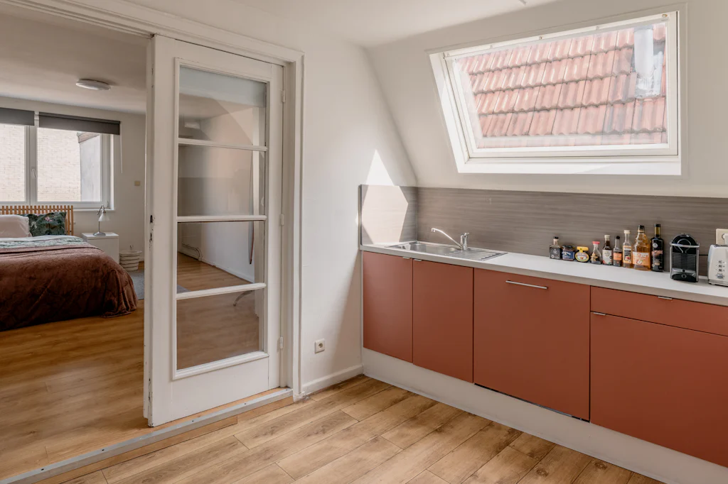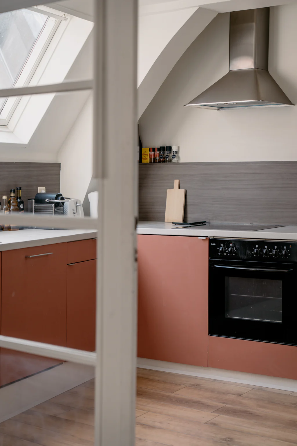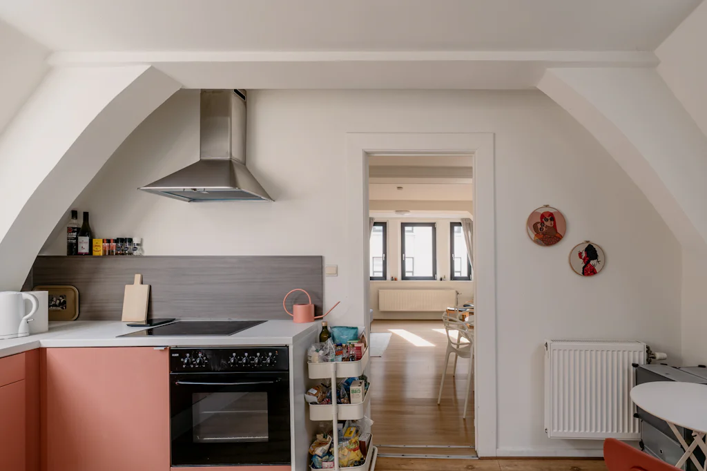 In een traditioneel 17de eeuws diephuis bevindt zich op de bovenste verdieping een gemeubeld appartement waar je als kind al van droomde ooit te wonen. Een dakappartement met de perfecte onvolmaaktheid van schuine wanden. En dat in combinatie met een tijdloze en gezellig inrichting waar werkelijk alles aanwezig is. Op die manier kan je met je koffer aankomen en genieten van al wat Antwerpen te bieden heeft. De open verbinding tussen de leefruimte en de keuken zorgt voor een aangenaam ruimtegevoel, terwijl een dubbele glazen deur het licht van de slaapkamer door het hele appartement laat schijnen. De badkamer sluit aan op de slaapkamer en is verrassend ruim, heeft een ligbad en een wasmachine.