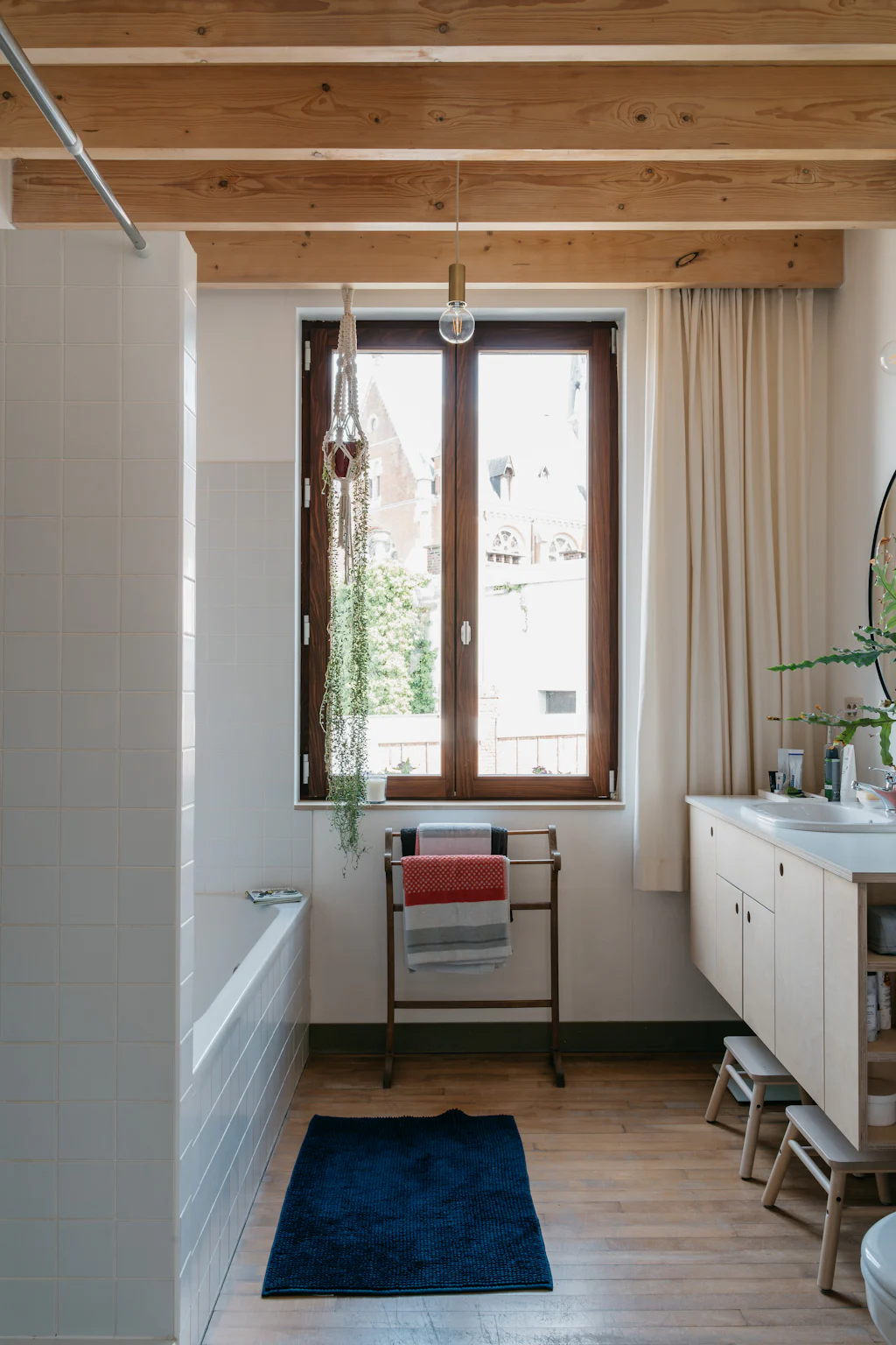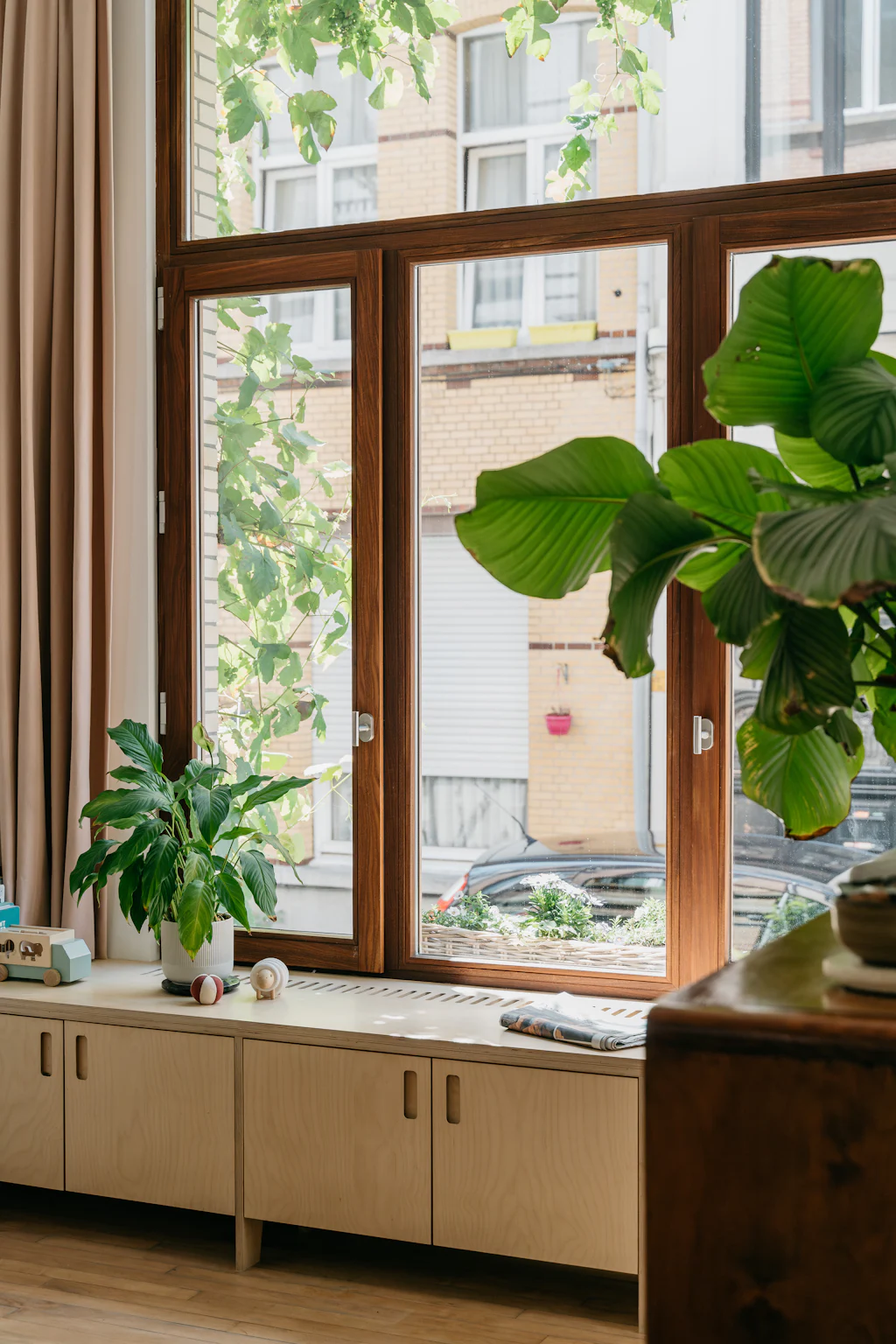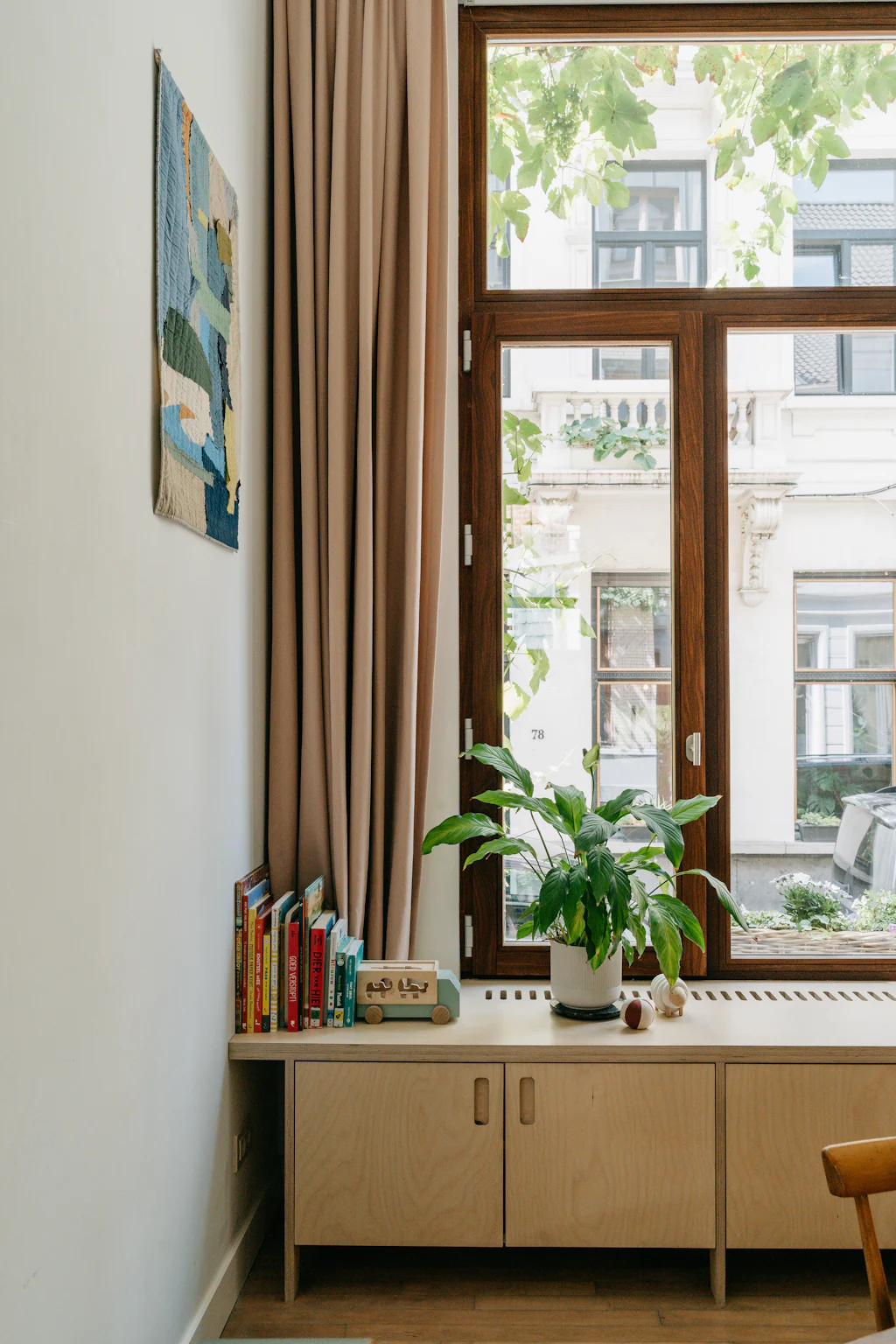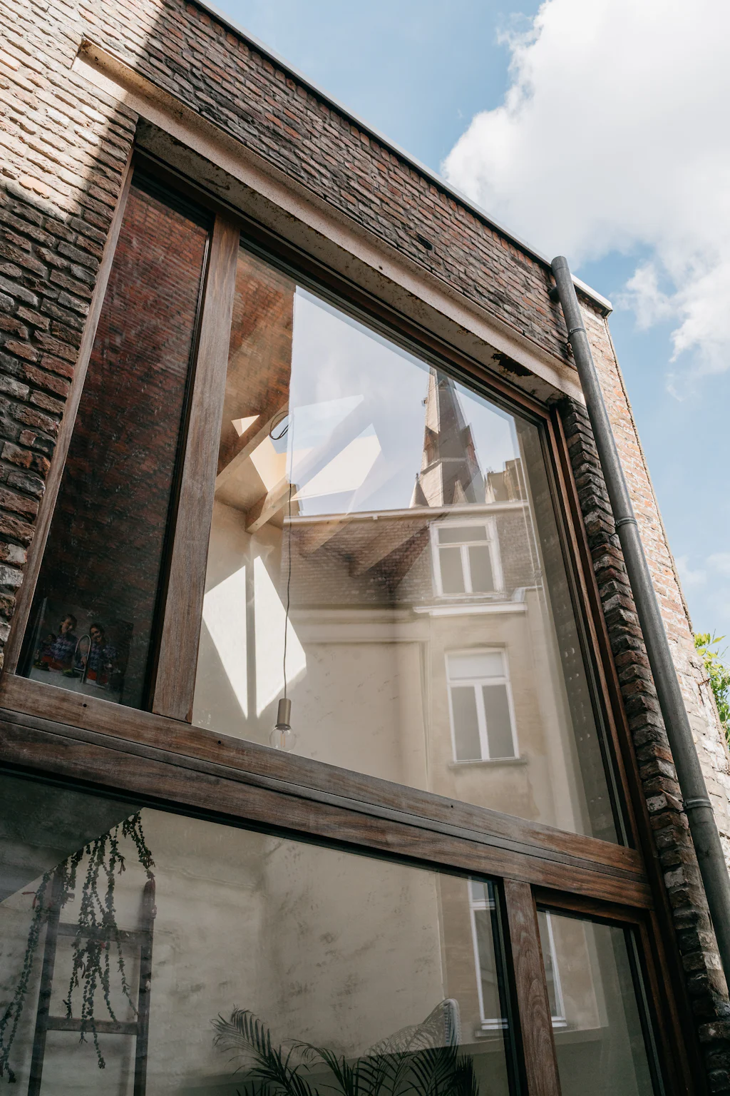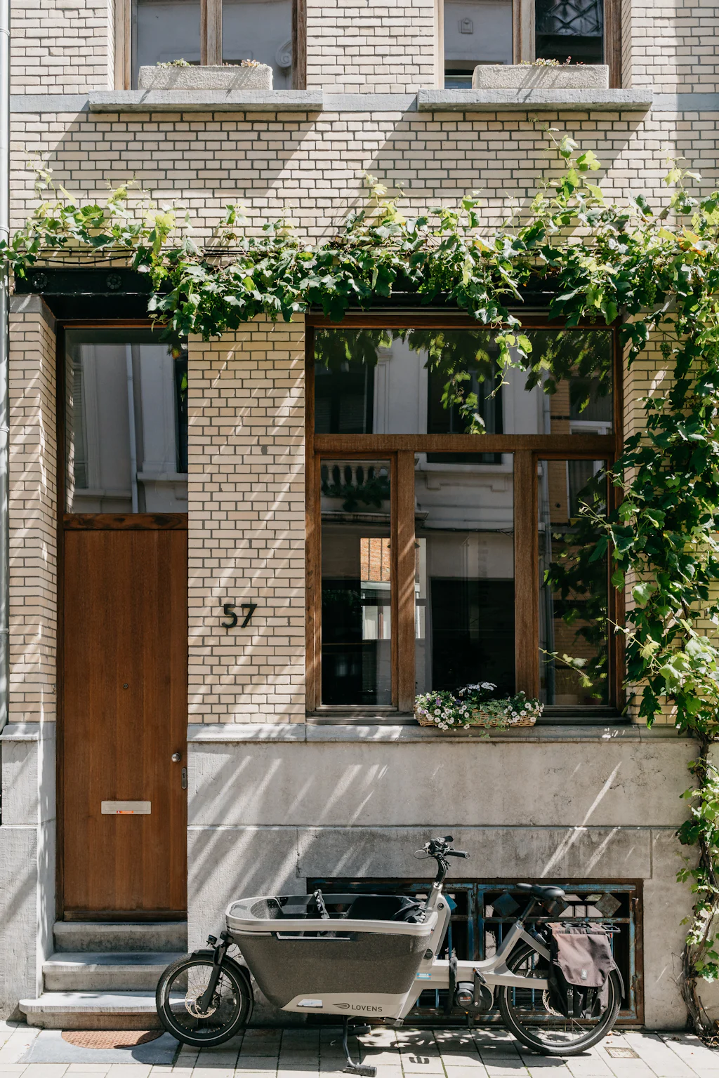 Aangekocht in 2014 en volledig verbouwd in 2015. Met een architect als eigenaar een koud kunstje. En een goddelijk resultaat, onder het goedkeurend oog van de Sint-Willibrorduskerk. Vanop het dakterras van ca. 27 m² geniet je van een fabelachtig uitzicht op die kerk. En buiten de klokkenluider, heeft quasi niemand uitzicht op jou. Net voor je daar naar buiten stapt, loop je voorbij de bijkeuken. Daar kan je een koelkast plaatsen voor gekoelde drankjes en heerlijke hapjes bereiden voor je eventuele gasten. Het vergunde dakterras bevindt zich trouwens op een volledig nieuw opgebouwd volume. Je leest het goed, de 2de verdieping werd nieuw gebouwd, boven op het bestaande huis. Op die verdieping bevinden zich een grote slaapkamer (die nog opgesplitst kan worden in 2 slaapkamers) en een badkamer. Met douche, ligbad én een op maat ontworpen badkamermeubel. Een verdieping lager vinden we dan de leefruimte. Daar kan je door de bibliotheek naar de masterbedroom wandelen. Een schuifdeur in deze bibliotheek geeft je de mogelijkheid om de ruimtes van elkaar te scheiden of ze als 1 te gaan gebruiken. In dat laatste geval verhuis je je bed gewoon naar de verdieping erboven. De keuken en de eetkamer bevinden zich op de gelijkvloerse verdieping. In de eetkamer heb je een leuke connectie met de straat, door het grote raam onder de druivelaar. En omdat het straatniveau iets lager ligt, blijft je privacy behouden. Voorbijgangers zien dus niet welke soep jij die dag eet. In het hele huis ligt een massieve esdoorn parketvloer. Die is afkomstig uit een voormalig squashlokaal in de buurt (CenterCourt in Boho). De potten staan dus in een wip van het gasvuur op de eettafel. De niet kokende partner kan trouwens perfect volgen wat in de soep gedraaid wordt, vanuit de bureauruimte met zicht op de keuken en op het mediterraan aperitiefhoekje buiten. Een heel inspirerende plek, met een mooie vide tot aan de 1ste tussenverdieping (waar zich een gastentoilet met wastafel bevindt). Als laatste etage in de woning, hebben we … de kelder. Droog en mét daglicht. Geen straf om hier de was te doen. We geven je graag ook nog even mee dat de Sint-Willibrordusstraat sinds 2018 als woonerf werd ingericht. Als je de straat uitwandelt, kom je aan het Willibrordusplein waar je het mozaiektapijt van kunstenaar Bren Heymans kan ontdekken. Hij inspireerde zich voor het ontwerp op traditionele Marokkaanse tapijten en verwerkte daarin zowel een reflectie van de Sint-Willibrorduskerk als een basketbalveld. Elk jaar worden hier verschillende evenementen georganiseerd door het wijkcomité zoals Kerkstraat Plage of het Warm Winters Wijkfeest. Het plein is het hart van de Willibrorduswijk!
