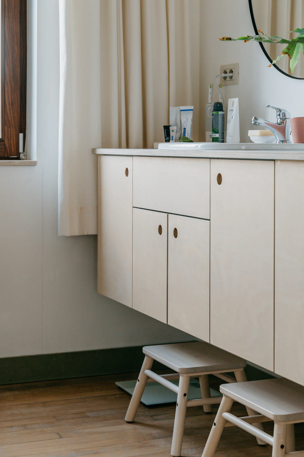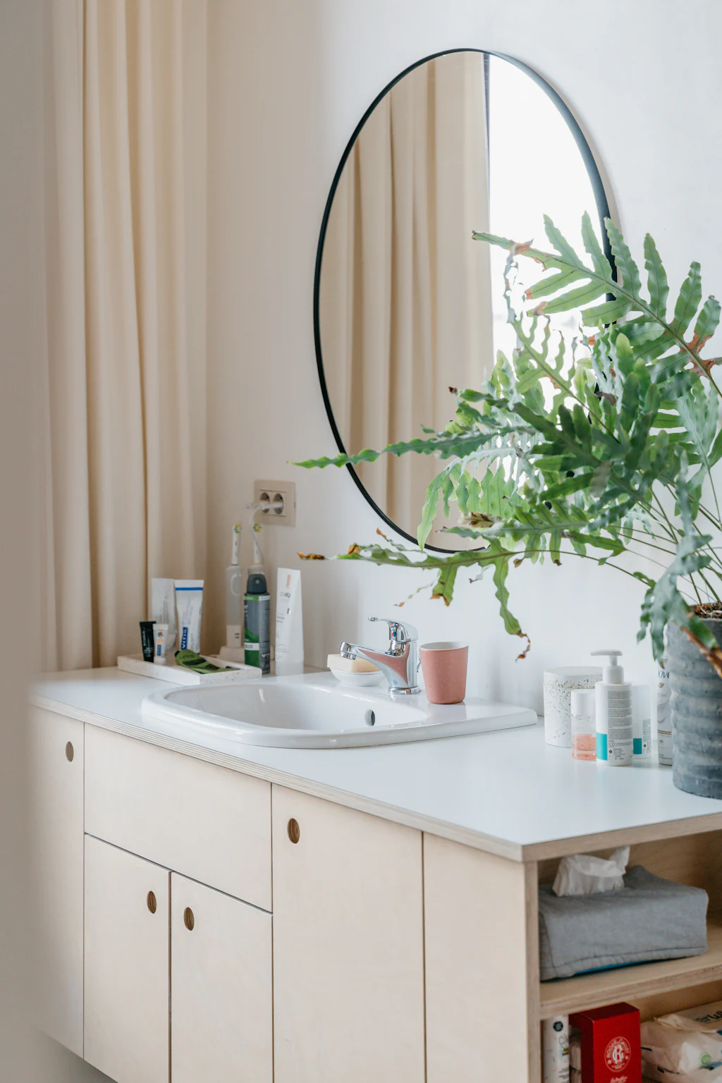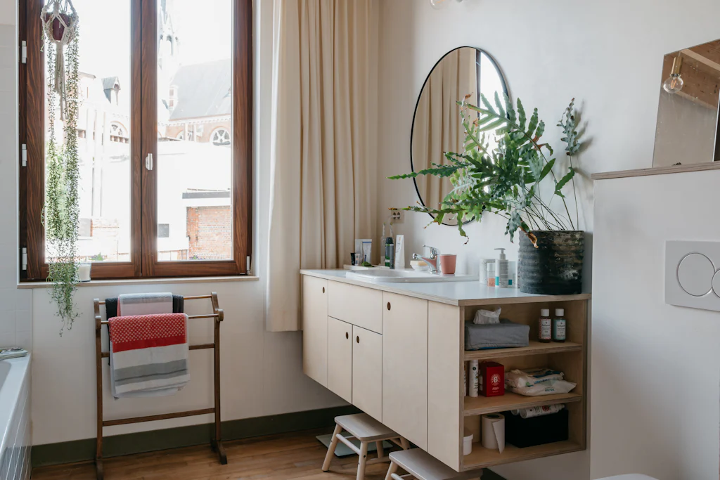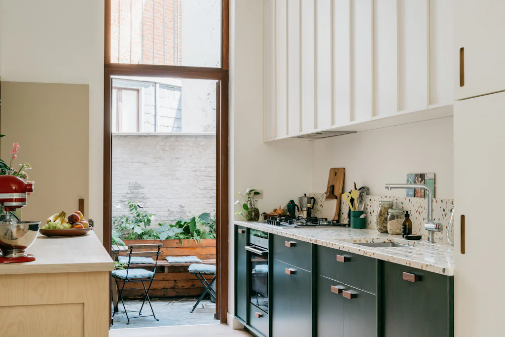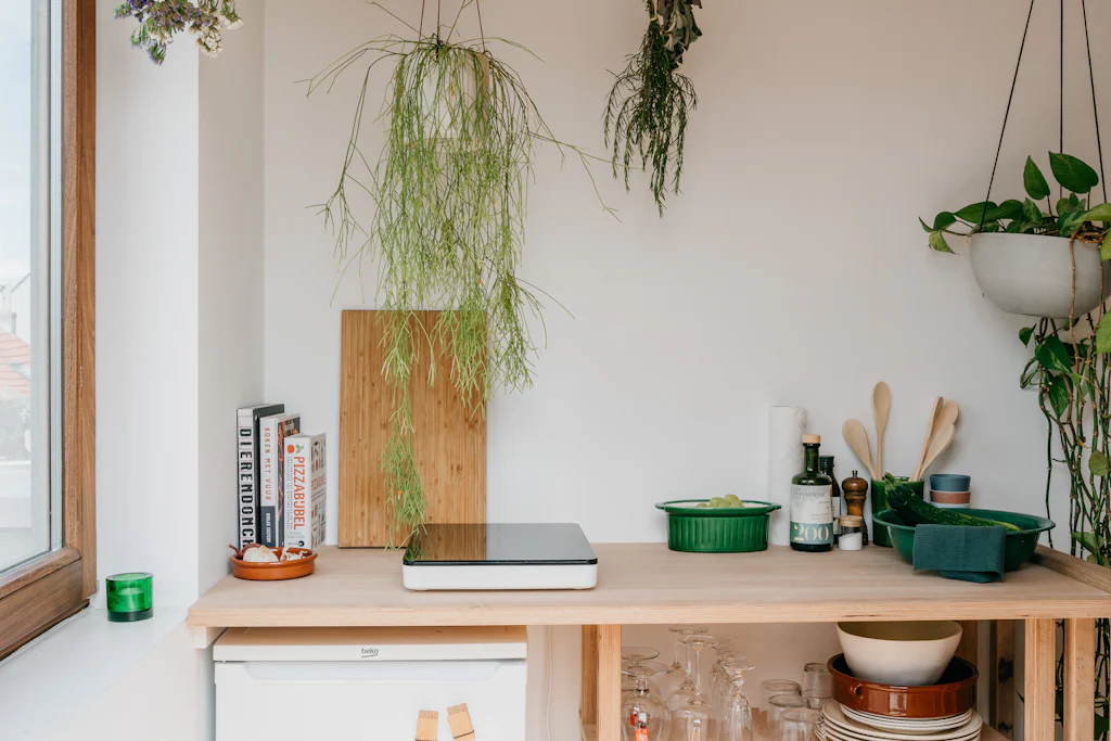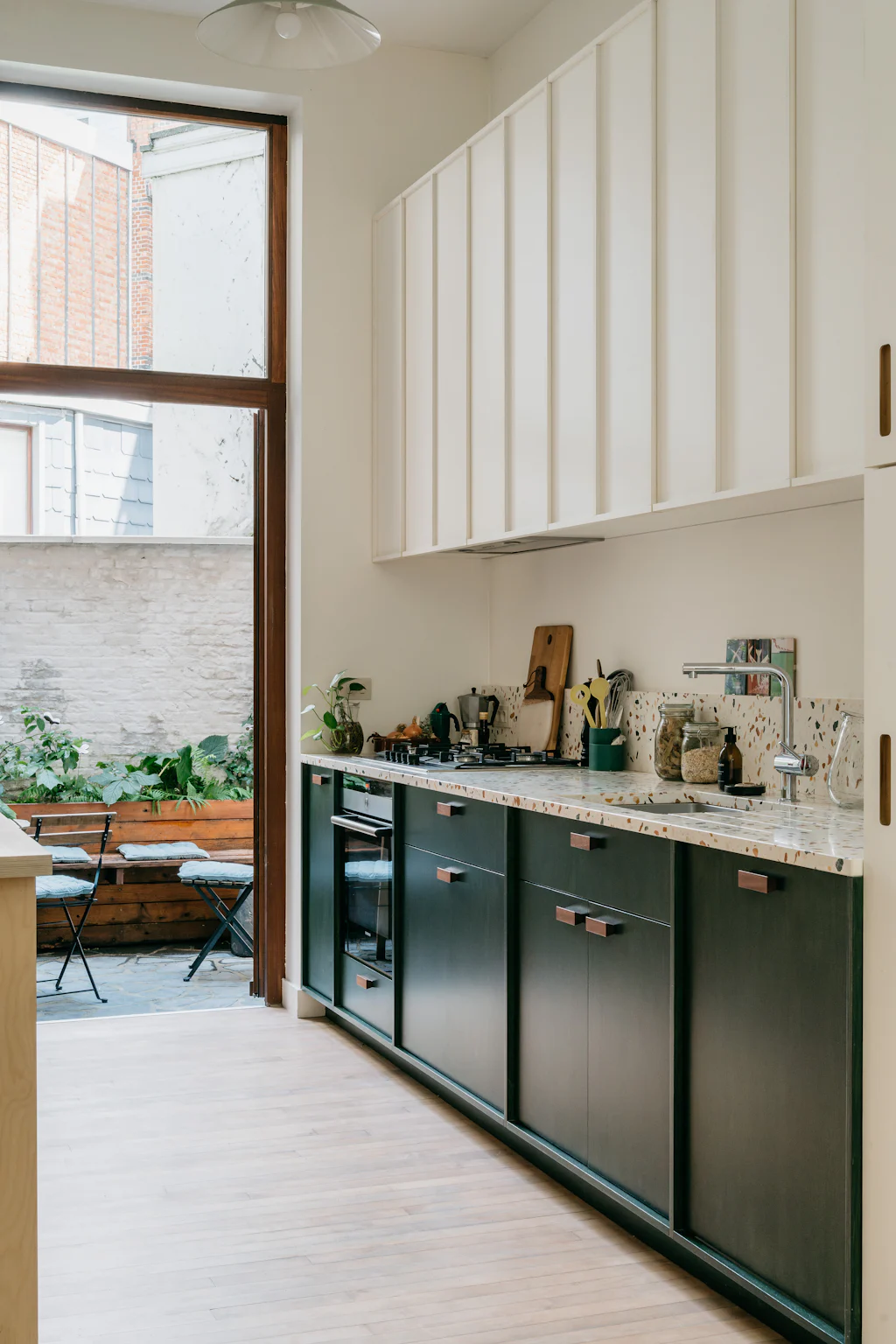 Aangekocht in 2014 en volledig verbouwd in 2015. Met een architect als eigenaar een koud kunstje. En een goddelijk resultaat, onder het goedkeurend oog van de Sint-Willibrorduskerk. Vanop het dakterras van ca. 27 m² geniet je van een fabelachtig uitzicht op die kerk. En buiten de klokkenluider, heeft quasi niemand uitzicht op jou. Net voor je daar naar buiten stapt, loop je voorbij de bijkeuken. Daar kan je een koelkast plaatsen voor gekoelde drankjes en heerlijke hapjes bereiden voor je eventuele gasten. Het vergunde dakterras bevindt zich trouwens op een volledig nieuw opgebouwd volume. Je leest het goed, de 2de verdieping werd nieuw gebouwd, boven op het bestaande huis. Op die verdieping bevinden zich een grote slaapkamer (die nog opgesplitst kan worden in 2 slaapkamers) en een badkamer. Met douche, ligbad én een op maat ontworpen badkamermeubel. Een verdieping lager vinden we dan de leefruimte. Daar kan je door de bibliotheek naar de masterbedroom wandelen. Een schuifdeur in deze bibliotheek geeft je de mogelijkheid om de ruimtes van elkaar te scheiden of ze als 1 te gaan gebruiken. In dat laatste geval verhuis je je bed gewoon naar de verdieping erboven. De keuken en de eetkamer bevinden zich op de gelijkvloerse verdieping. In de eetkamer heb je een leuke connectie met de straat, door het grote raam onder de druivelaar. En omdat het straatniveau iets lager ligt, blijft je privacy behouden. Voorbijgangers zien dus niet welke soep jij die dag eet. In het hele huis ligt een massieve esdoorn parketvloer. Die is afkomstig uit een voormalig squashlokaal in de buurt (CenterCourt in Boho). De potten staan dus in een wip van het gasvuur op de eettafel. De niet kokende partner kan trouwens perfect volgen wat in de soep gedraaid wordt, vanuit de bureauruimte met zicht op de keuken en op het mediterraan aperitiefhoekje buiten. Een heel inspirerende plek, met een mooie vide tot aan de 1ste tussenverdieping (waar zich een gastentoilet met wastafel bevindt). Als laatste etage in de woning, hebben we … de kelder. Droog en mét daglicht. Geen straf om hier de was te doen. We geven je graag ook nog even mee dat de Sint-Willibrordusstraat sinds 2018 als woonerf werd ingericht. Als je de straat uitwandelt, kom je aan het Willibrordusplein waar je het mozaiektapijt van kunstenaar Bren Heymans kan ontdekken. Hij inspireerde zich voor het ontwerp op traditionele Marokkaanse tapijten en verwerkte daarin zowel een reflectie van de Sint-Willibrorduskerk als een basketbalveld. Elk jaar worden hier verschillende evenementen georganiseerd door het wijkcomité zoals Kerkstraat Plage of het Warm Winters Wijkfeest. Het plein is het hart van de Willibrorduswijk!