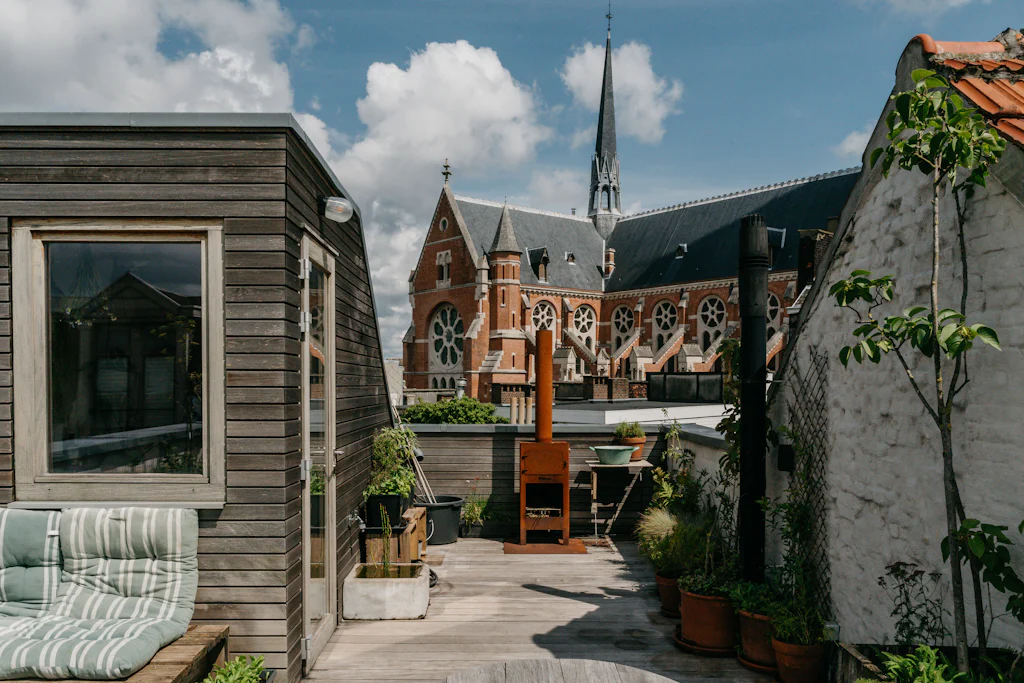 Goddelijke woning met zonovergoten dakterras onder de vleugels van de Sint-Willibrorduskerk*