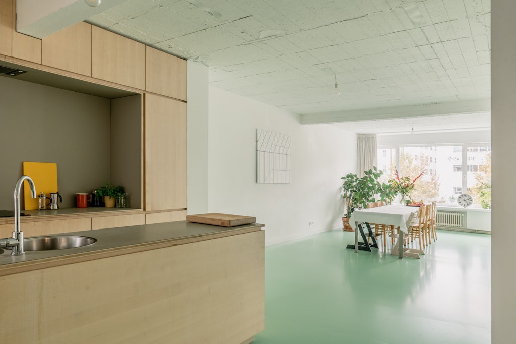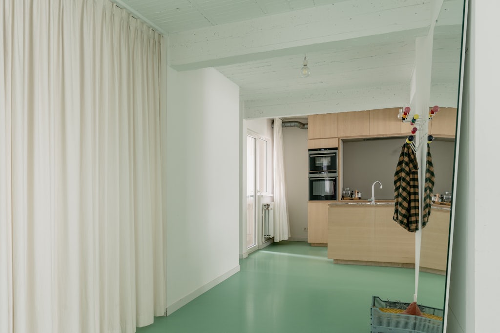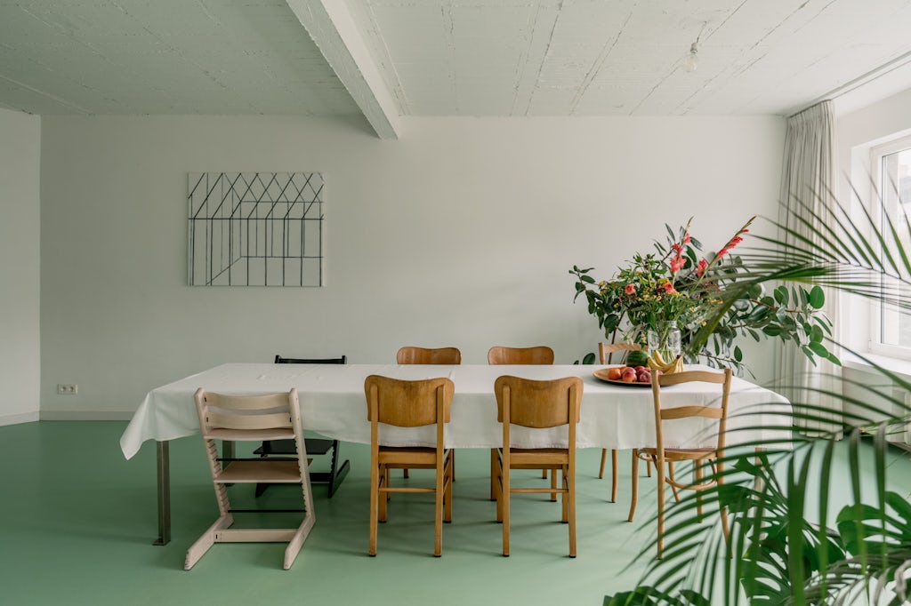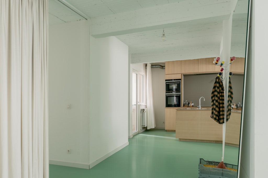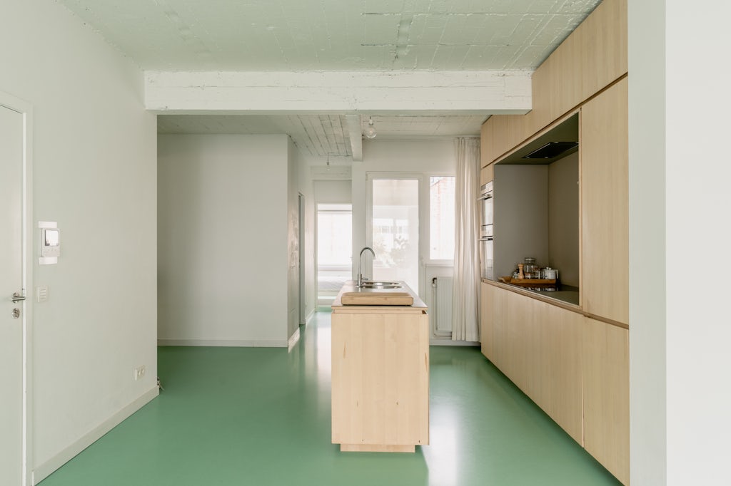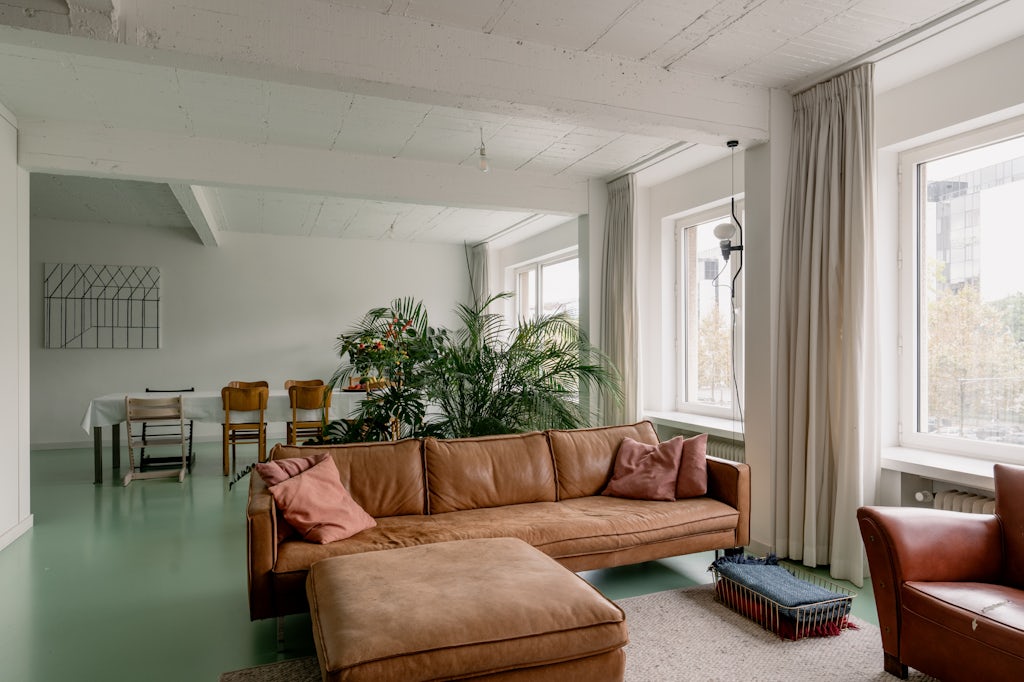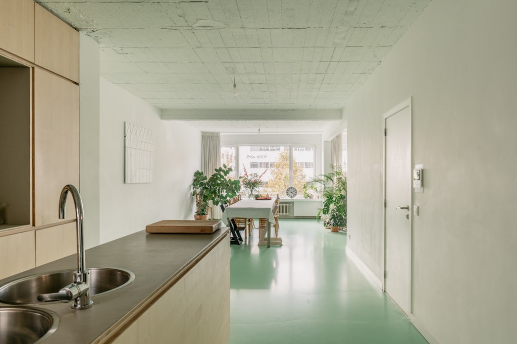 Groen licht (en dito vloer) voor deze urban loft in een appartementsgebouw uit 1962