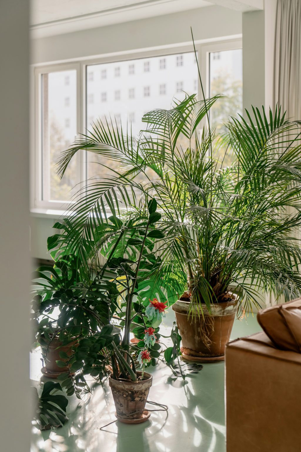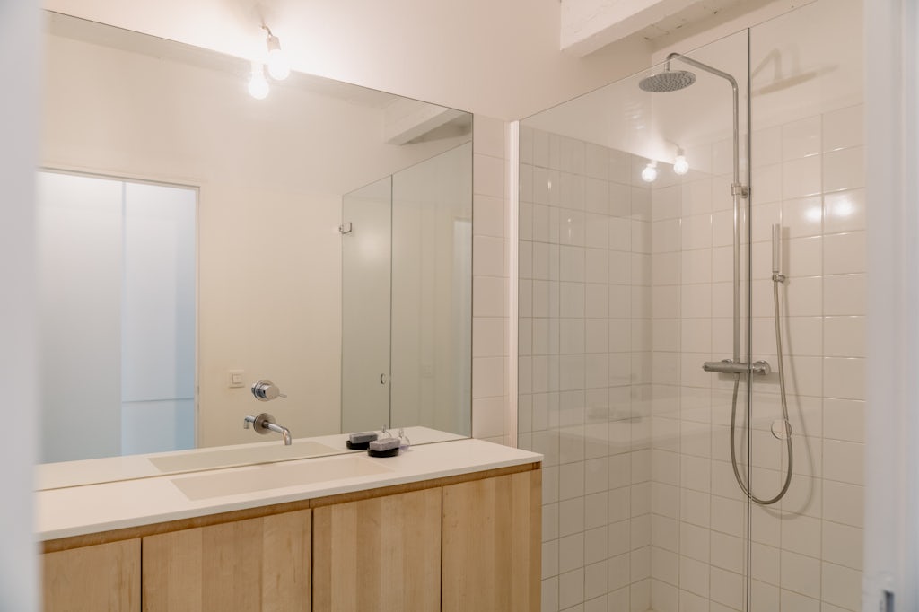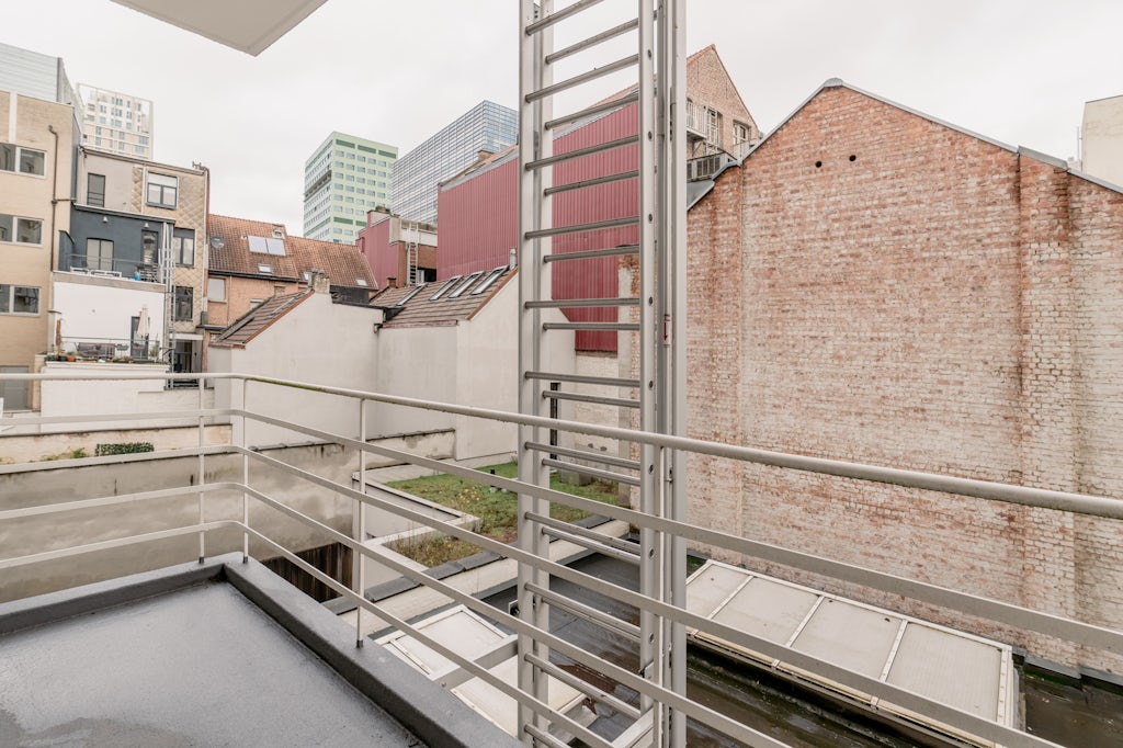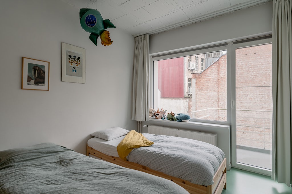 Aan de Italiëlei staat een appartementsgebouw waar je zonder omkijken voorbijloopt. Niets bijzonder, geen uitstraling. Tot je het appartement op de 2de verdieping bekijkt. Dan slaat de onverschilligheid om in bewondering. Twee kantoorruimtes op die verdieping werden in 2014 ontmanteld en verbouwd tot één bevallige loft van 174 m². Met een open floor plan: keuken, leefkamer, eetkamer en home office rond een centrale kolom met inkomhal. Het plafond in zichtbeton, de groene gietvloer en gordijnen als visuele space dividers zorgen voor een evenwicht tussen een meer industriële uitstraling enerzijds en warmte en gezelligheid anderzijds. Het zachte muntgroen van de vloer combineert trouwens mooi met het meer donkere groen van de planten. Die groeien weelderig dankzij een voorgevel die quasi volledig in glas werd uitgevoerd. De 3 slaapkamers bevinden zich aan de rustige achterzijde van het appartement. Twee daarvan geven toegang naar een terras. Bij de keuken en home office bevinden zich trouwens nog 2 extra terrassen. Zowel de keuken als de badkamer zijn uitgevoerd in multiplex berkenhout en beschikken over hedendaags comfort: alle nodige toestellen om een lekker maaltijd voor te bereiden in de keuken en een moderne regendouche in de badkamer. De wasmachine kan in een ingemaakte kast geplaatst worden.
