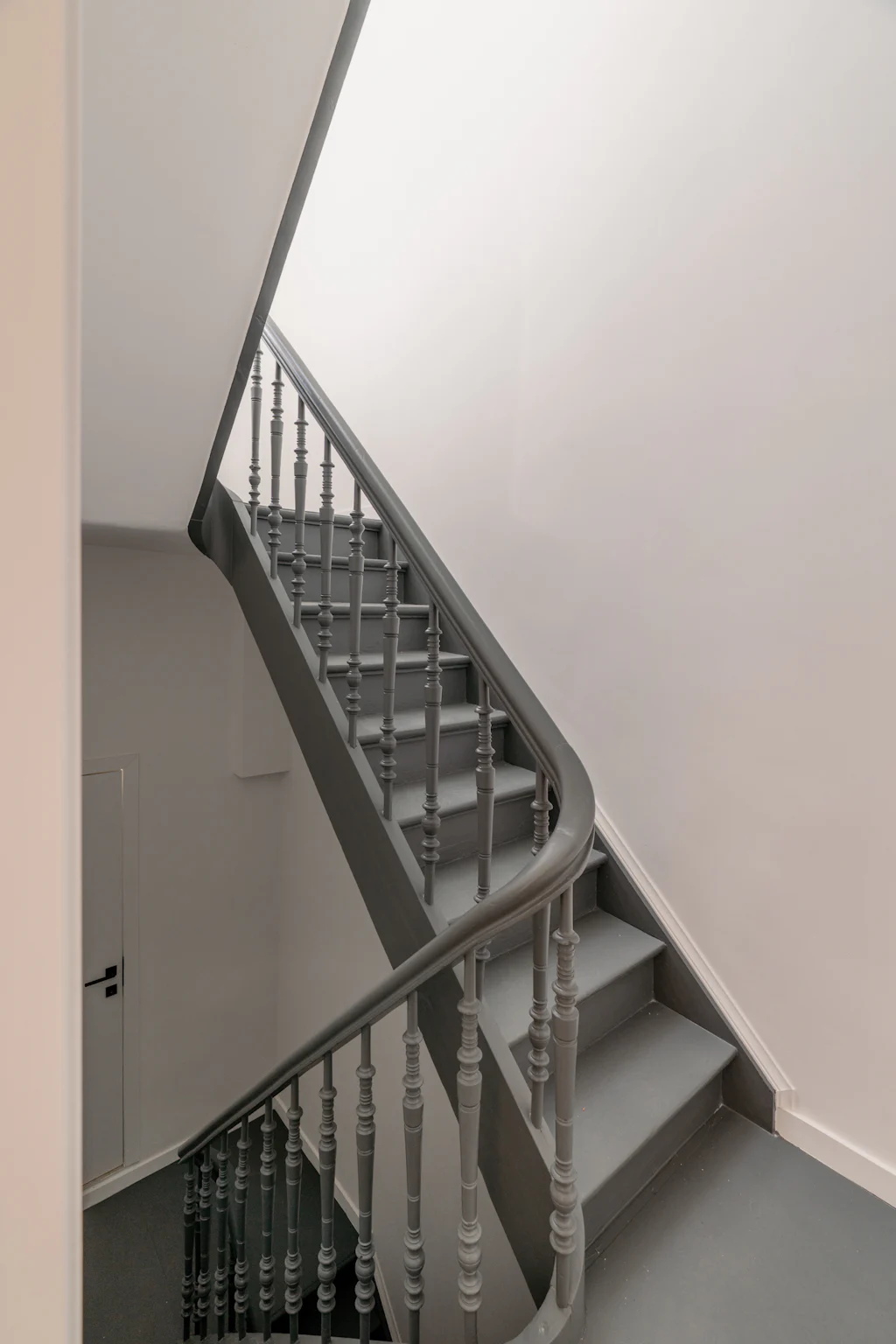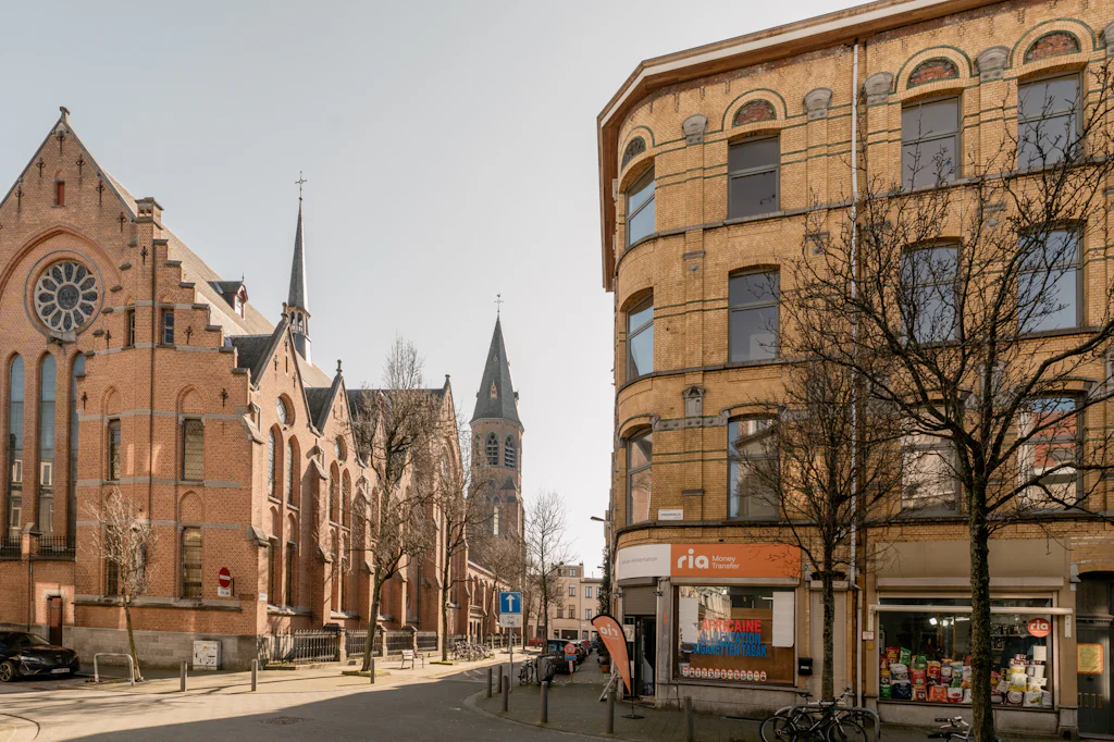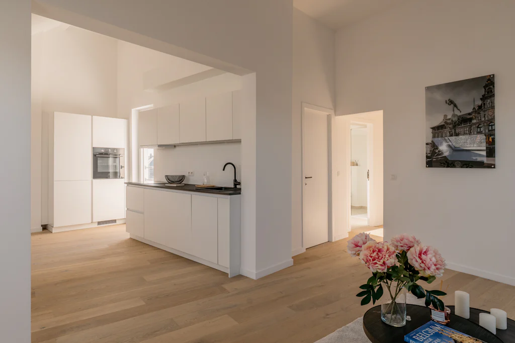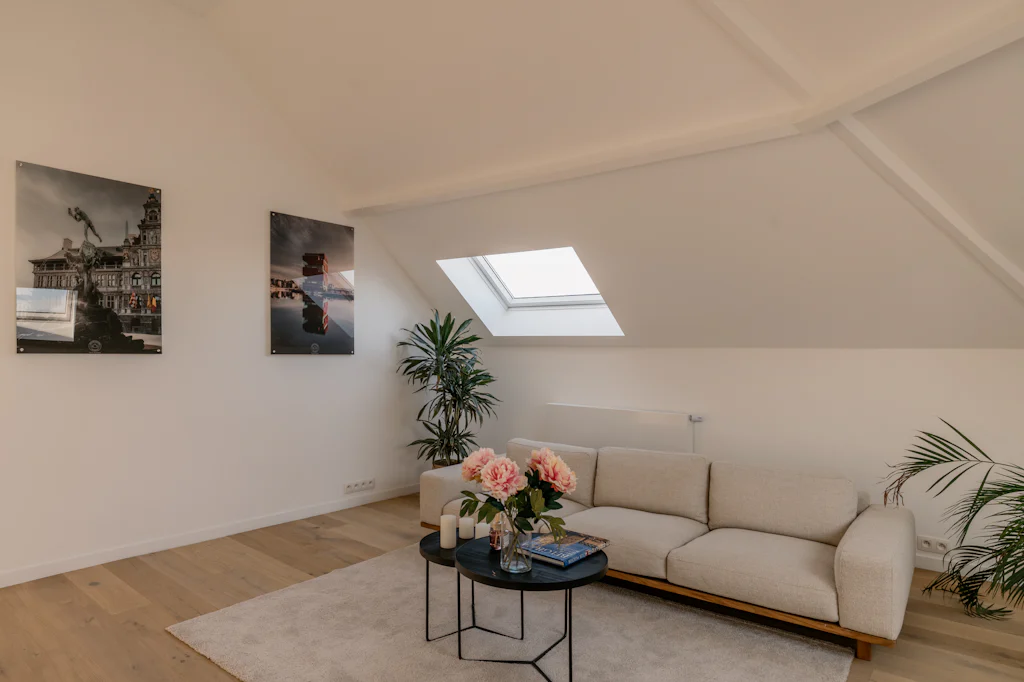 In de schaduw van de neogotische Sint-Eligiuskerk, op de hoek van de Onderwijsstraat en de Familiestraat, straalt een gevel in geelkleuring metselwerk. En niet alleen de gevel straalt, ook het interieur doet dat. Het licht valt met grote bundels binnen door de vele ramen die kenmerkend zijn voor een hoekgebouw en een ligging op een bovenste verdieping. De leefruimte heeft die kenmerkende geborgenheid van wonen onder een dak, waar houten spanten de contouren tekenen. Maar vergis je niet: door de hoge nok voelt het nergens beklemmend. Integendeel. De keuken, uitgerust met kasten aan 2 wanden, loopt naadloos over in een zitruimte die dus zowel intiem als luchtig is. En in plaats van 2 kleine slaapkamers en een badkamer op postzegelformaat, werd er gekozen voor ruimte. De slaapkamer heeft een oppervlakte van maar liefst 18 m². Daarenboven beschikt het appartement trouwens ook over een handige bergruimte en een kelder.