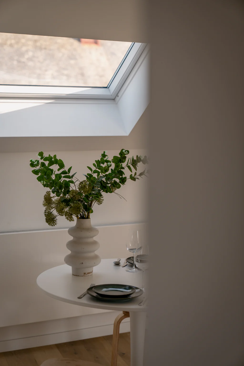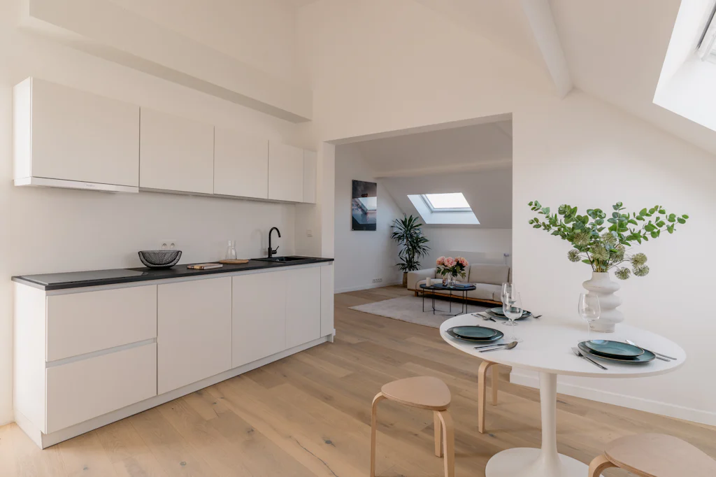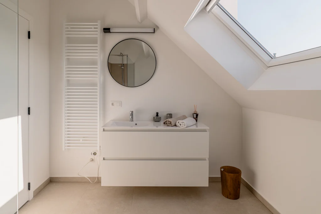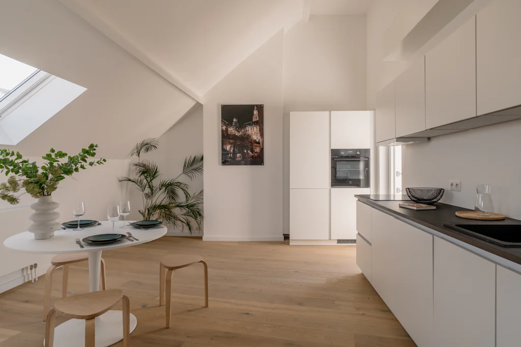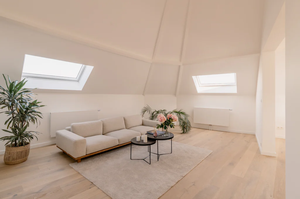 In de schaduw van de neogotische Sint-Eligiuskerk, op de hoek van de Onderwijsstraat en de Familiestraat, straalt een gevel in geelkleuring metselwerk. En niet alleen de gevel straalt, ook het interieur doet dat. Het licht valt met grote bundels binnen door de vele ramen die kenmerkend zijn voor een hoekgebouw en een ligging op een bovenste verdieping. De leefruimte heeft die kenmerkende geborgenheid van wonen onder een dak, waar houten spanten de contouren tekenen. Maar vergis je niet: door de hoge nok voelt het nergens beklemmend. Integendeel. De keuken, uitgerust met kasten aan 2 wanden, loopt naadloos over in een zitruimte die dus zowel intiem als luchtig is. En in plaats van 2 kleine slaapkamers en een badkamer op postzegelformaat, werd er gekozen voor ruimte. De slaapkamer heeft een oppervlakte van maar liefst 18 m². Daarenboven beschikt het appartement trouwens ook over een handige bergruimte en een kelder.