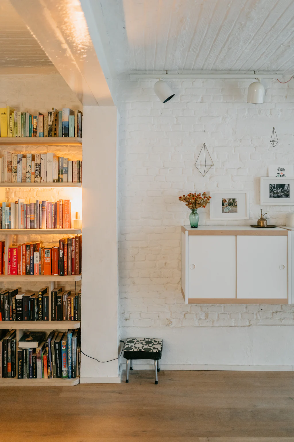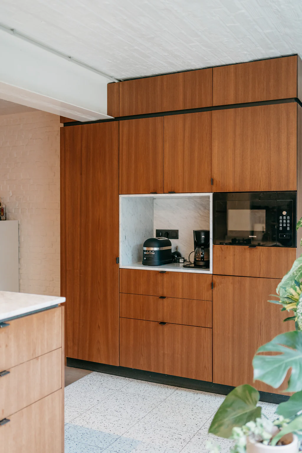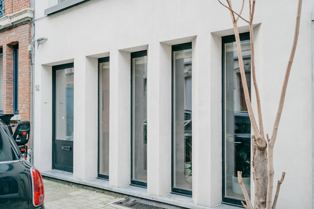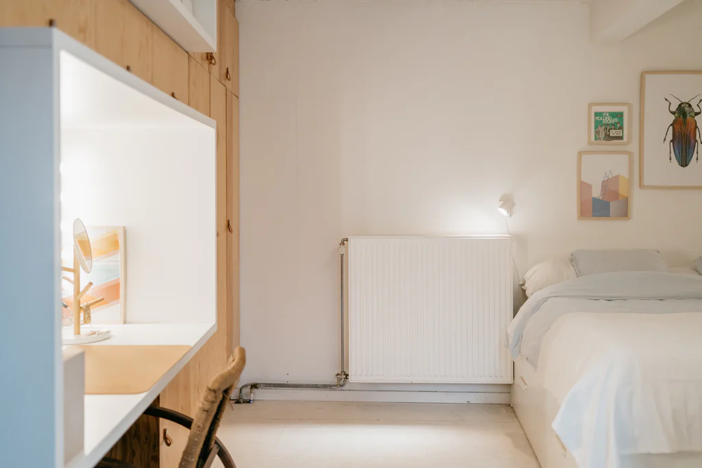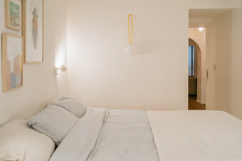 Het loft appartement, dat met zijn oppervlakte meer aanvoelt als een huis, is gelegen in de De Beuckerstraat. Eén van die leuke straten in de wijk Brederode, samen met onder andere de Juliaan Dillensstraat en de Catharina Beersmansstraat. De gevel geeft niets prijs: lange, zwarte ramen en een witte gevel (geeuw) maar quelle sorpresa bij binnenkomst. Een heerlijk eclectisch interieur met ronde vormen, muren in ruwe baksteen, marmer, hout en veel kleur! Je weet niet waar eerst te kijken, al werkt de keuken als magneet. Volledig uitgerust met kwalitatieve toestellen van de merken Siemens en Liebherr en een marmeren werkblad. Via een schuifdeur geeft ze directe toegang naar de stadstuin van ca. 25 m². De kachel van het merk ‘Weltevree’ (zal wel zijn) nodigt als het ware uit om ineens te blijven zitten voor een gezellige winterborrel. Toch maar even terug naar binnen, we zijn nog niet helemaal rond. De zithoek bevindt zich ietwat apart, knus! Onder het tapijt zit de trap naar de kelder verstopt, in de ingemaakte kasten de rommel. Een 1ste kamer is opgedeeld in 2 delen, met een soort van dressing. De 2 andere kamers bevinden zich aan de rustige achterzijde. De masterbedroom heeft ingemaakte kasten met zo’n leuke make-up tafel. En een eigen toegang naar de stadstuin. De badkamer is licht, ruim en warm. Leuke eyecather daar is de toegang naar de douche, die doet denken aan een grotwoning in Matera of Cappadocië (prachtige plekjes, zoek maar even op).