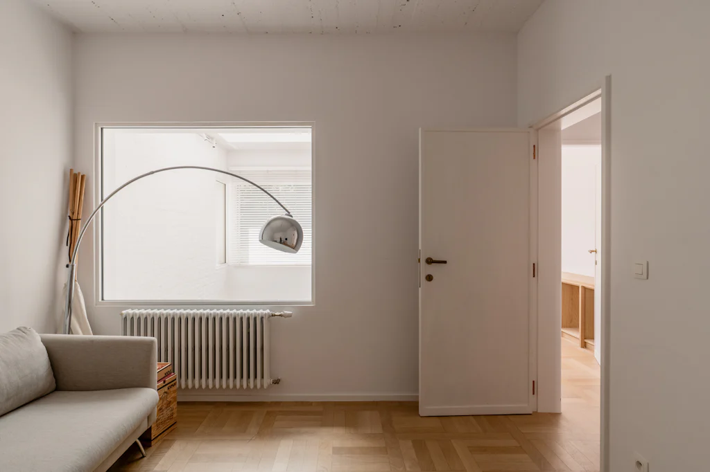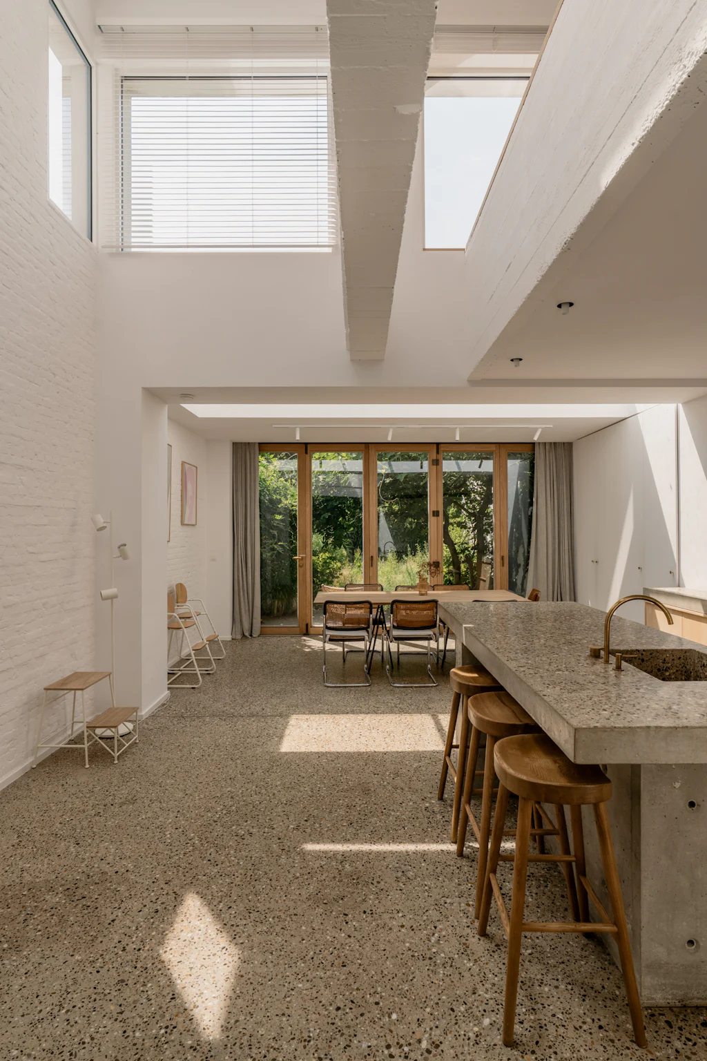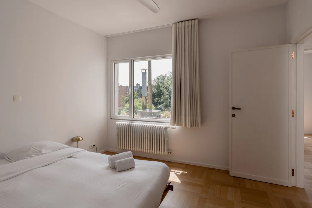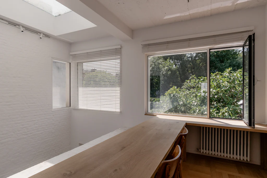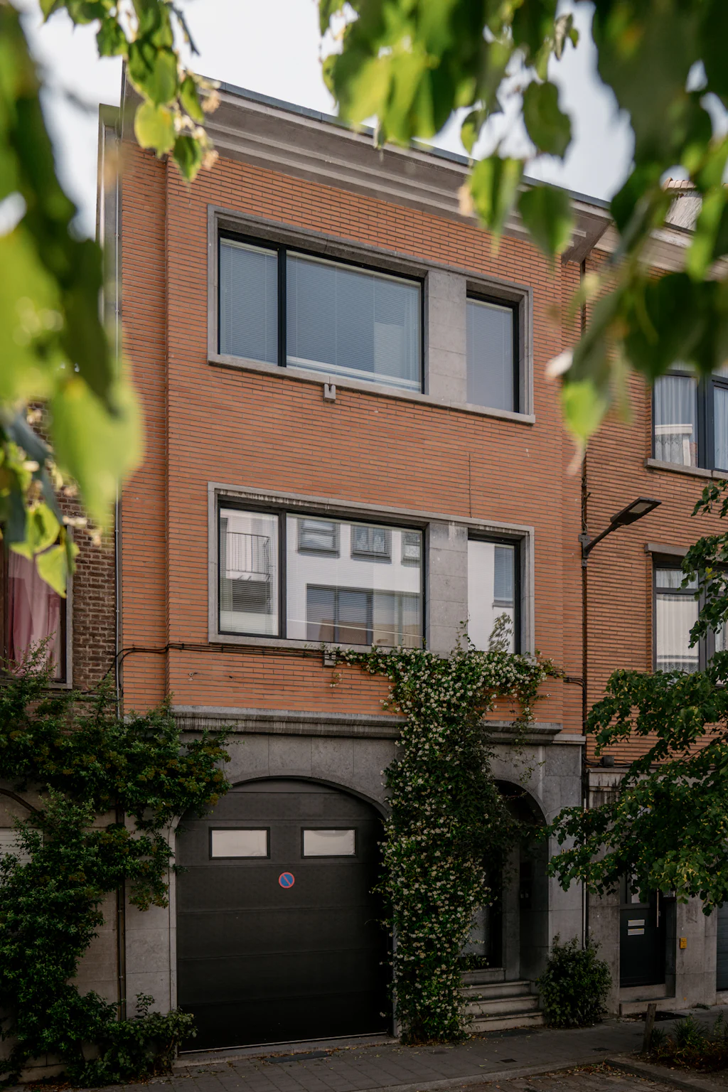 2024 markeert het jaar van de grondige renovatie. Met de persoonlijke signatuur van de eigenaar kreeg het ontwerp betekenisvolle vorm, waarin schoonheid en functionaliteit samenkomen. Denk aan een Japans douchetoilet, sobere Visible V lichtschakelaars en een discrete waskoker die vuile sokken geruisloos afvoert naar de wasmachine in de kelder. Jawel, badkamers in meervoud, want 4 slaapkamers delen 2 ruime badkamers. Een extra kamer op de 1ste verdieping werd ingericht als home office met uitzicht op een groen dak en de tuin van maar liefst 80 m², een natuurreservaat aan eigen huis. De bakstenen muur in de leefruimte nodigt uit om een monumentaal kunstwerk of een expressief wandtapijt te etaleren, een statement piece dat elders zelden een plek vindt. De keuken, uitgevoerd in uitgewassen beton, is een kunstwerk op zich, en diezelfde materiaalkeuze vormt ook de basis voor de tijdloze badkamers. De houten harmonicadeuren die de eetkamer met de tuin verbinden, brengen warmte en natuurlijk uitstraling in de woning. In een zorgvuldig gekozen hoek van het huis ligt een besloten salonruimte, een plek die rust ademt en uitnodigt tot bezinning. Er valt nog veel te vertellen over deze woning, maar niets vervangt het gevoel dat ontstaat wanneer je hier zelf binnenstapt. We willen je wel nog meegeven dat de woning ook een enorme garage met elektrische poort en laadpaal heeft, een waardevolle troef in BoHo.