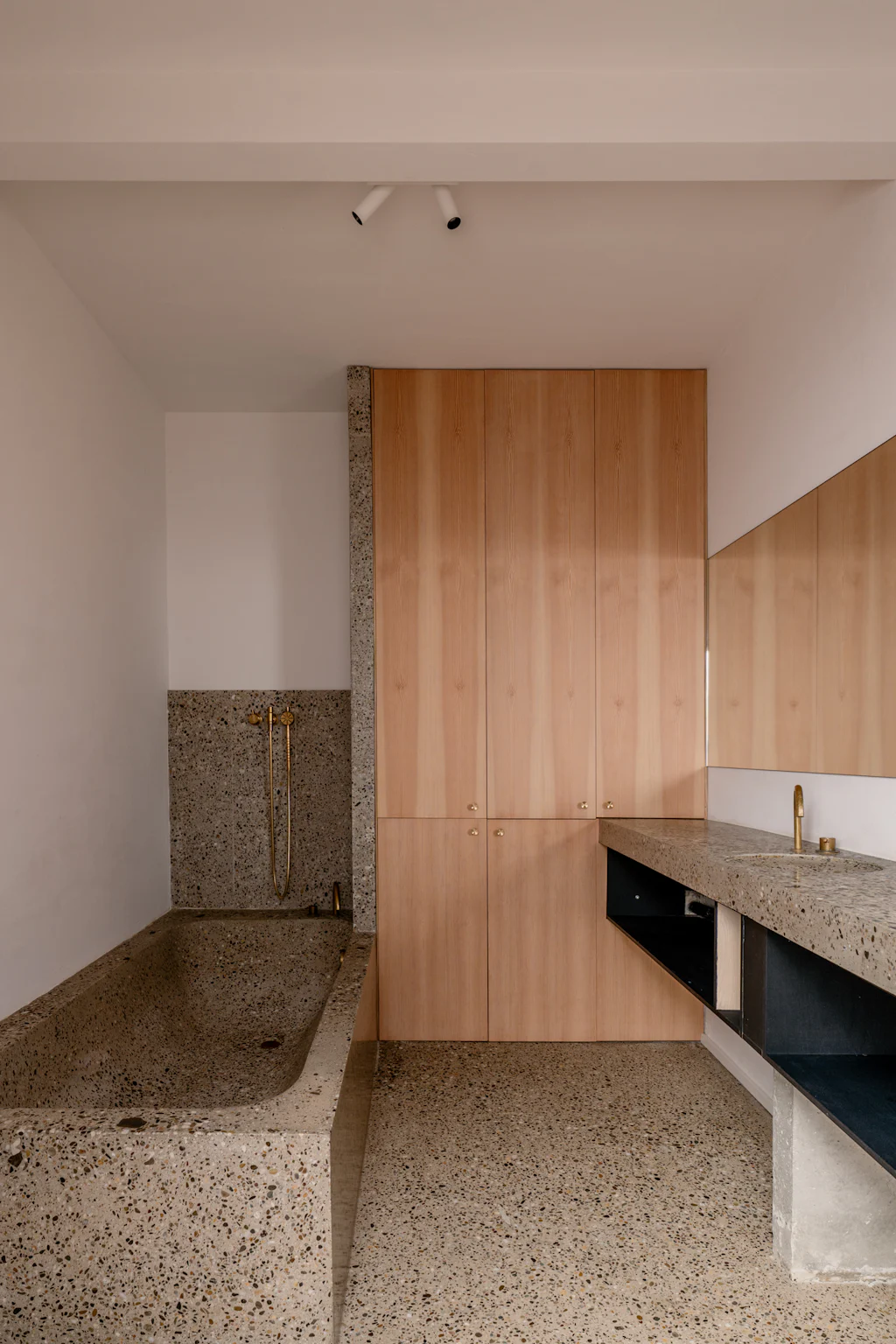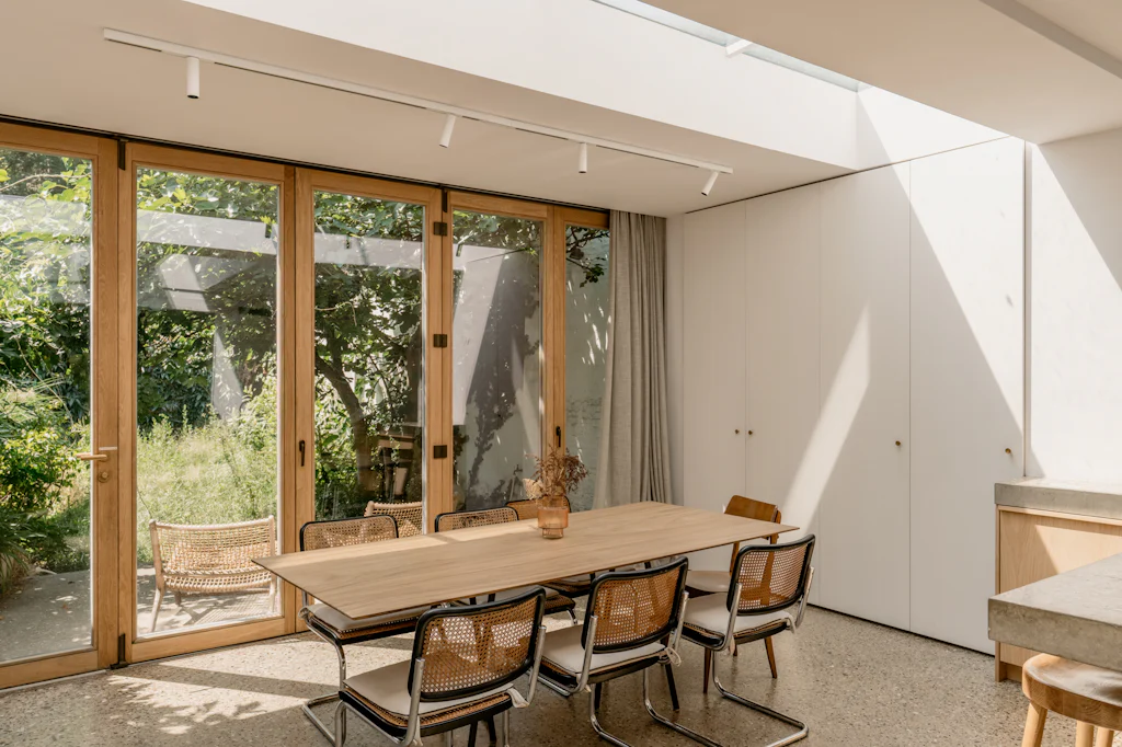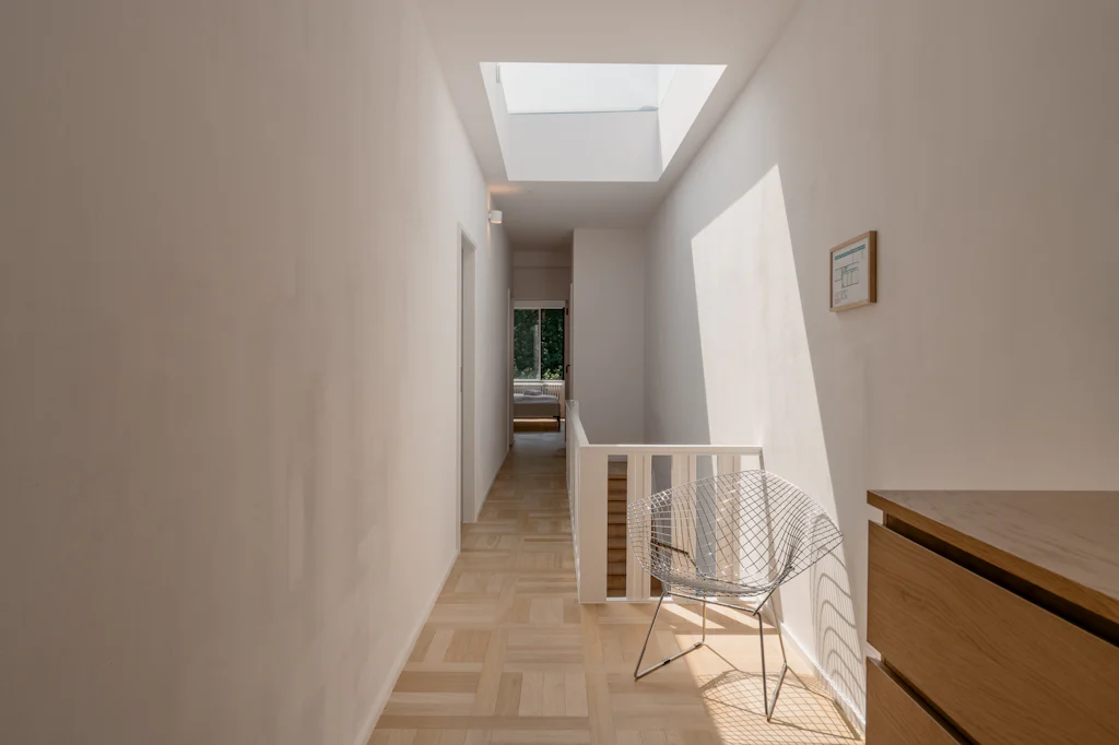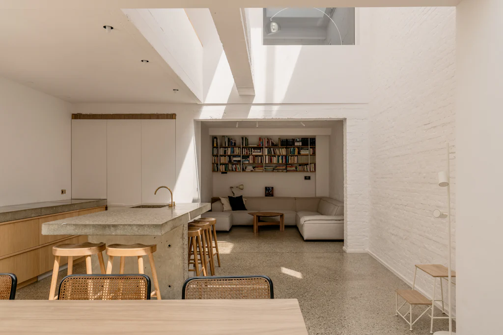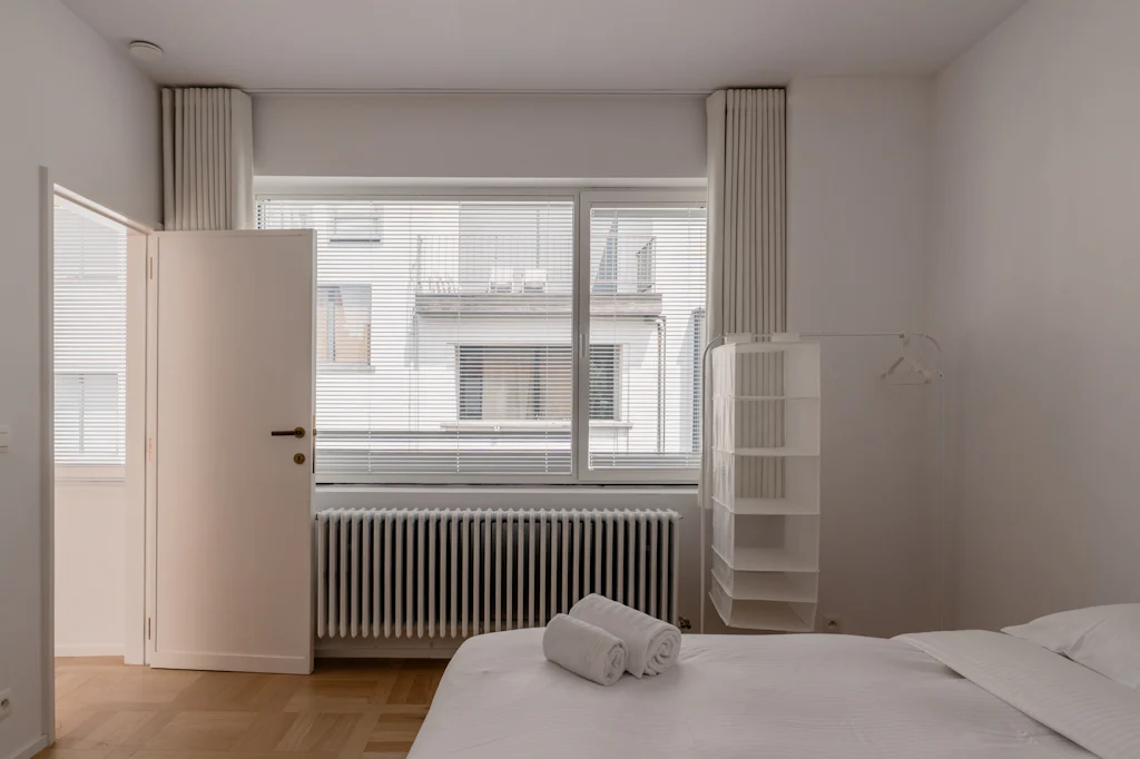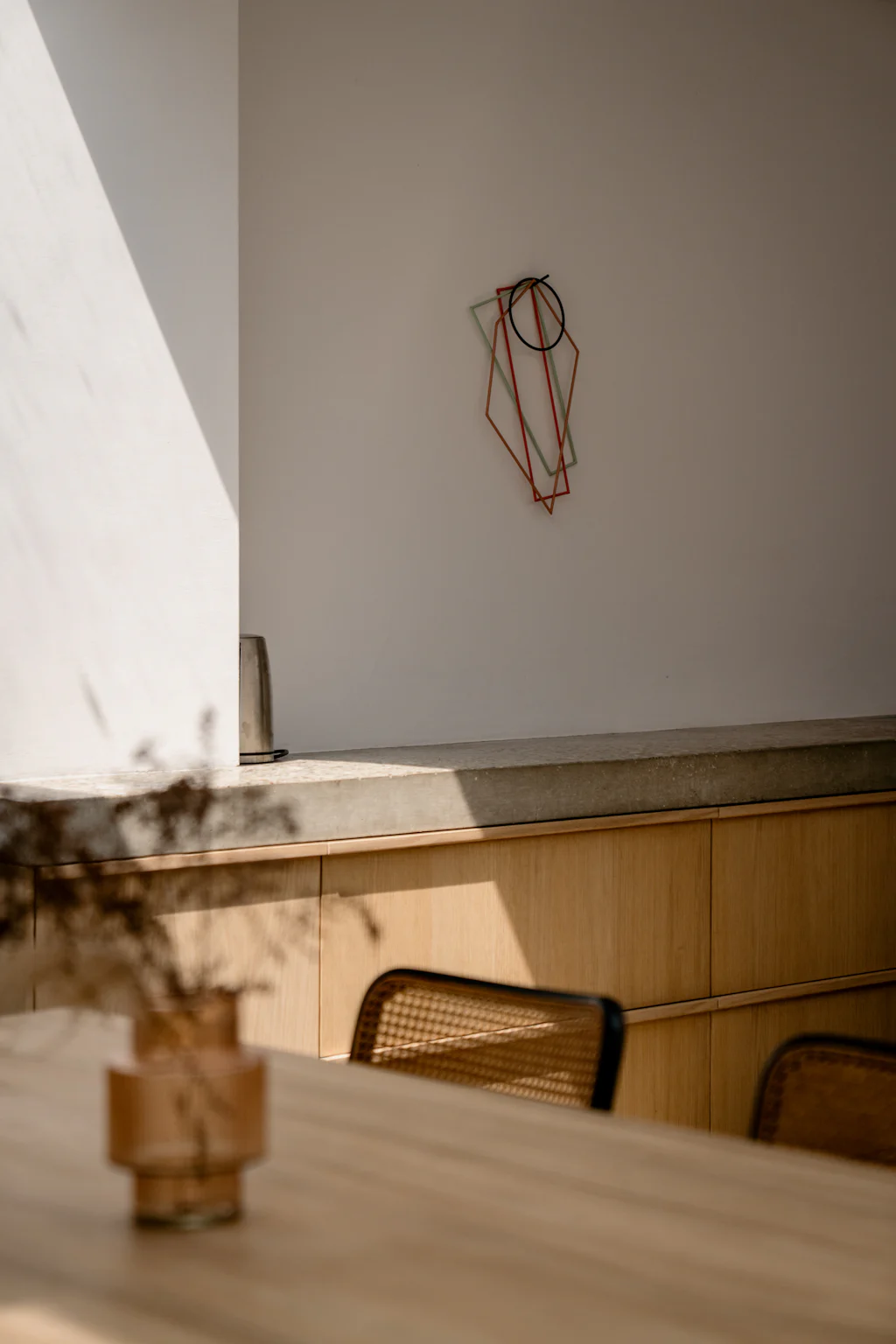 2024 markeert het jaar van de grondige renovatie. Met de persoonlijke signatuur van de eigenaar kreeg het ontwerp betekenisvolle vorm, waarin schoonheid en functionaliteit samenkomen. Denk aan een Japans douchetoilet, sobere Visible V lichtschakelaars en een discrete waskoker die vuile sokken geruisloos afvoert naar de wasmachine in de kelder. Jawel, badkamers in meervoud, want 4 slaapkamers delen 2 ruime badkamers. Een extra kamer op de 1ste verdieping werd ingericht als home office met uitzicht op een groen dak en de tuin van maar liefst 80 m², een natuurreservaat aan eigen huis. De bakstenen muur in de leefruimte nodigt uit om een monumentaal kunstwerk of een expressief wandtapijt te etaleren, een statement piece dat elders zelden een plek vindt. De keuken, uitgevoerd in uitgewassen beton, is een kunstwerk op zich, en diezelfde materiaalkeuze vormt ook de basis voor de tijdloze badkamers. De houten harmonicadeuren die de eetkamer met de tuin verbinden, brengen warmte en natuurlijk uitstraling in de woning. In een zorgvuldig gekozen hoek van het huis ligt een besloten salonruimte, een plek die rust ademt en uitnodigt tot bezinning. Er valt nog veel te vertellen over deze woning, maar niets vervangt het gevoel dat ontstaat wanneer je hier zelf binnenstapt. We willen je wel nog meegeven dat de woning ook een enorme garage met elektrische poort en laadpaal heeft, een waardevolle troef in BoHo.