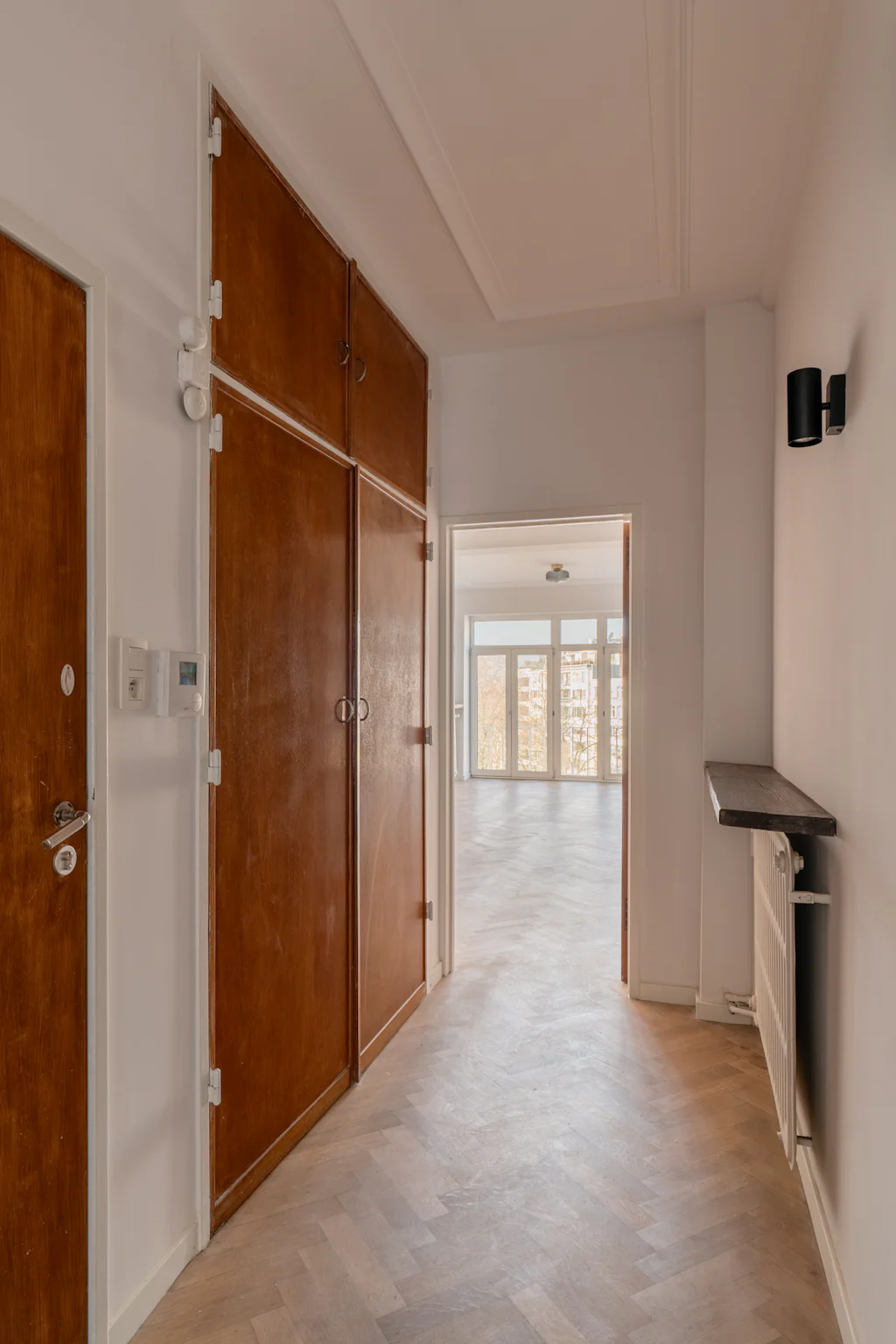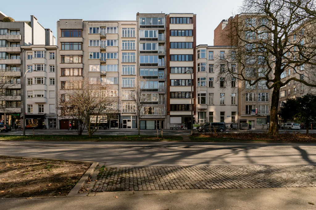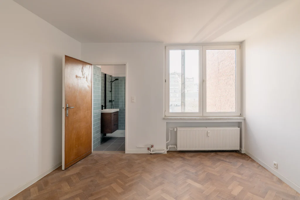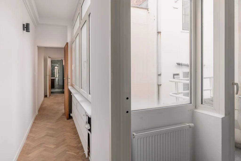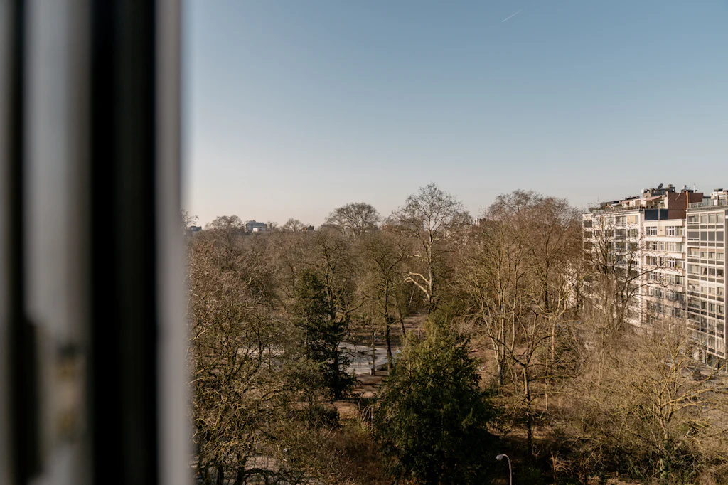 Het is misschien wat overdreven om te spreken van een penthouse. En zoals je weet, houden wij makelaars niet van overdrijven. Maar het appartement op de Quinten Matsijslei beschikt alleszins over veel van de typerende eigenschappen: uitgestrekt appartement op de bovenste verdieping van een hoog gebouw*, privacy en een panoramisch uitzicht over het Stadspark. En de kruinen van de bomen op de Maria-Theresialei. Je staat dus met 1 been in de Theaterwijk en met het andere in de wijk Diamant. Een vloer in genagelde visgraat parket, een ingemaakte houten vestiairekast en deuren met figuratief glas verklappen subtiel het bouwjaar van het appartement: 1953. De badkamer en de keuken zijn helaas/gelukkig niet meer van dat jaar en werden sinds 2021 vernieuwd. Aansluitend bij de keuken is een terrasje. De slaapkamer bevindt zich achteraan, bij de badkamer. Je geraakt er via een lange gang met veel natuurlijk licht. En laat dat nu nog zo’n kenmerk zijn van een penthouse: veel licht. Op het gelijkvloers bevindt zich een fietsenberging en het appartement beschikt ook over een privatieve kelder.