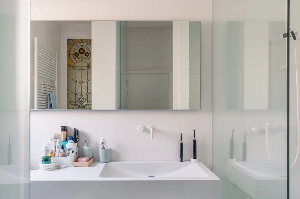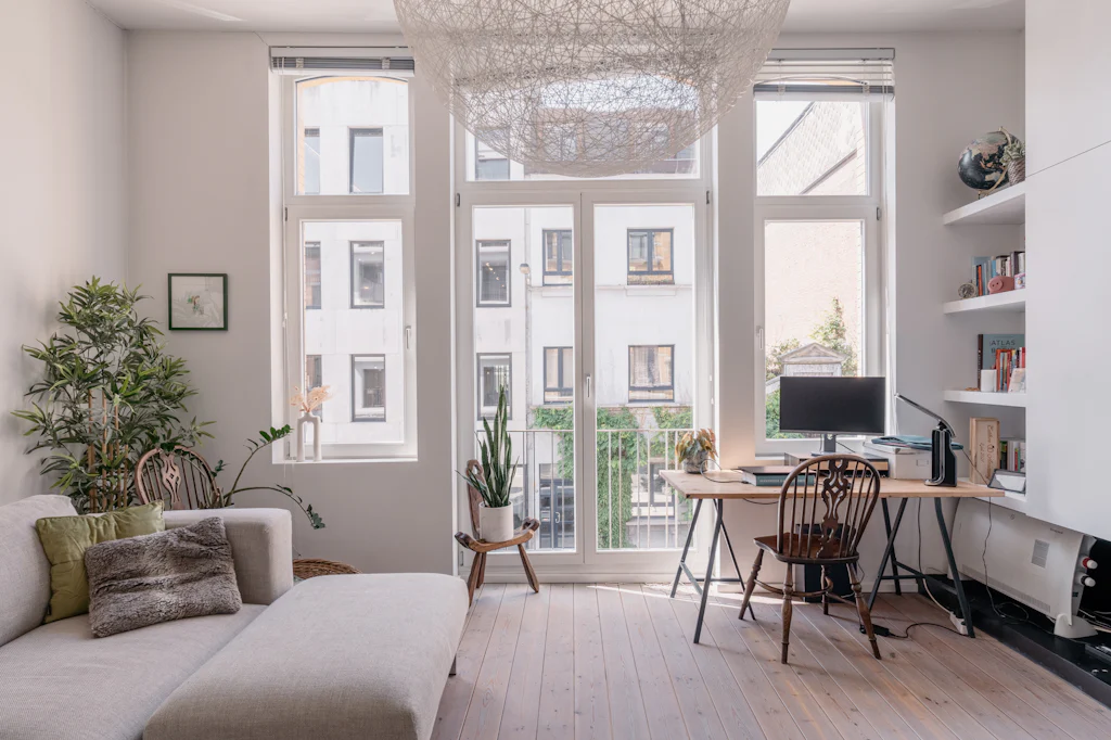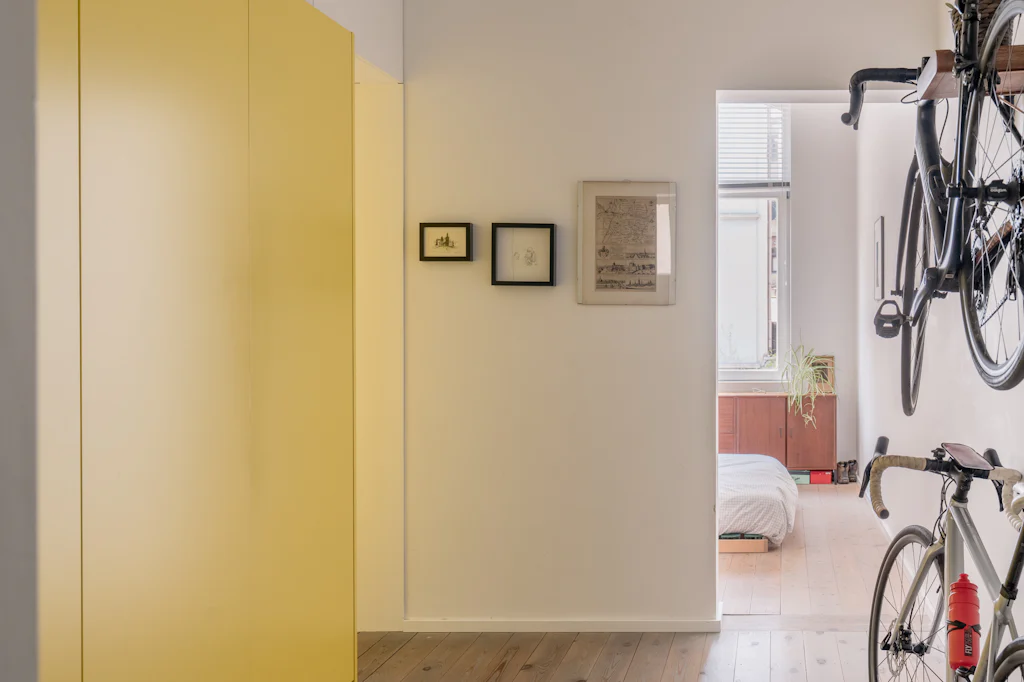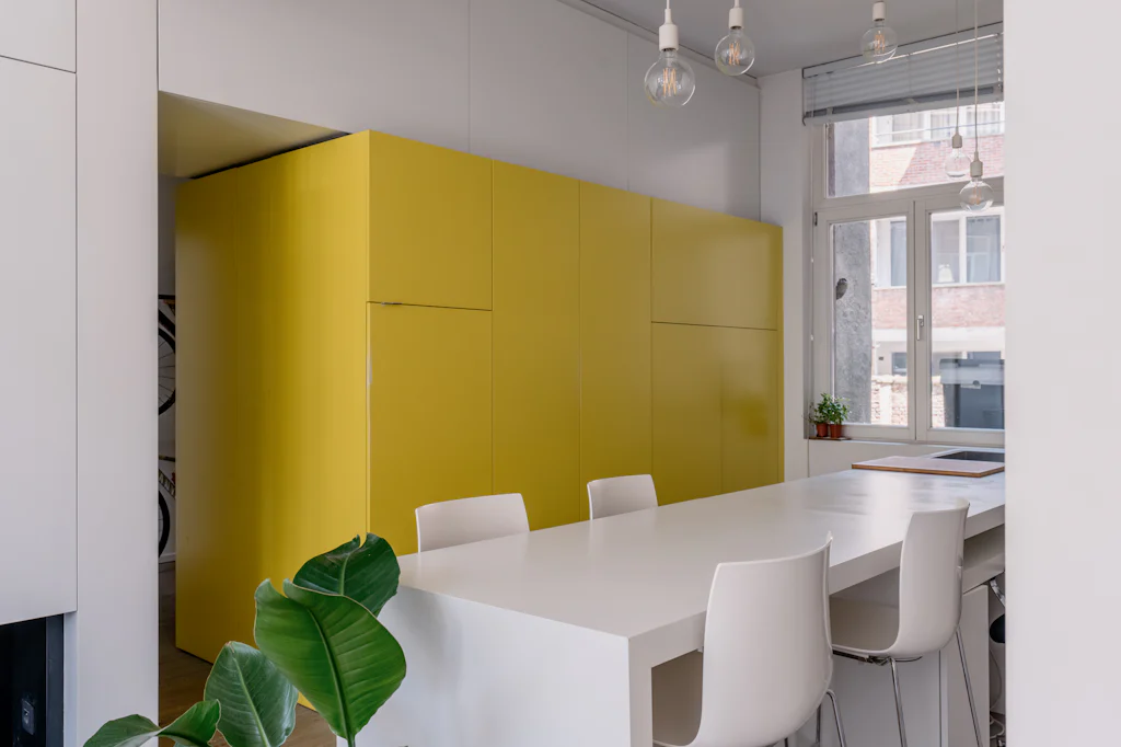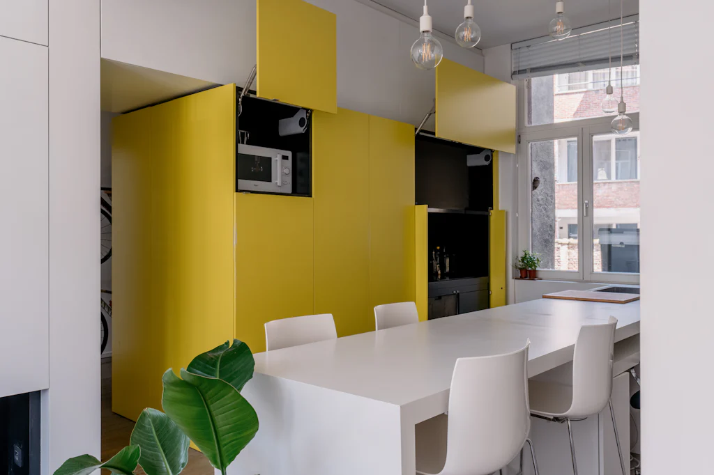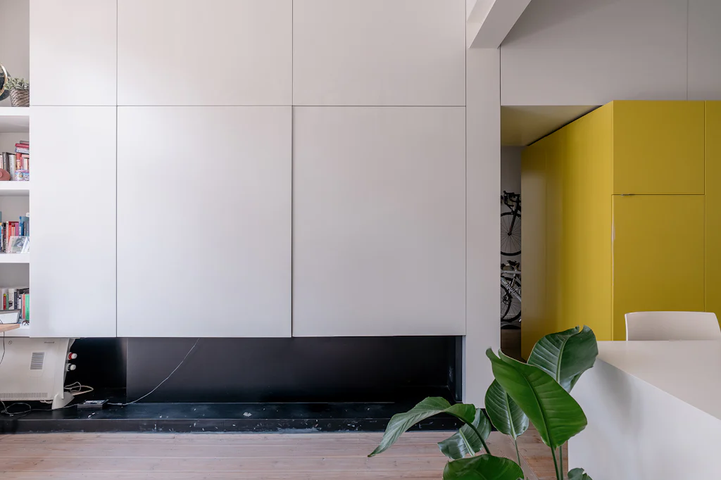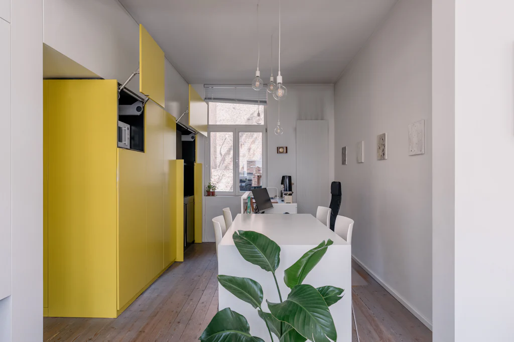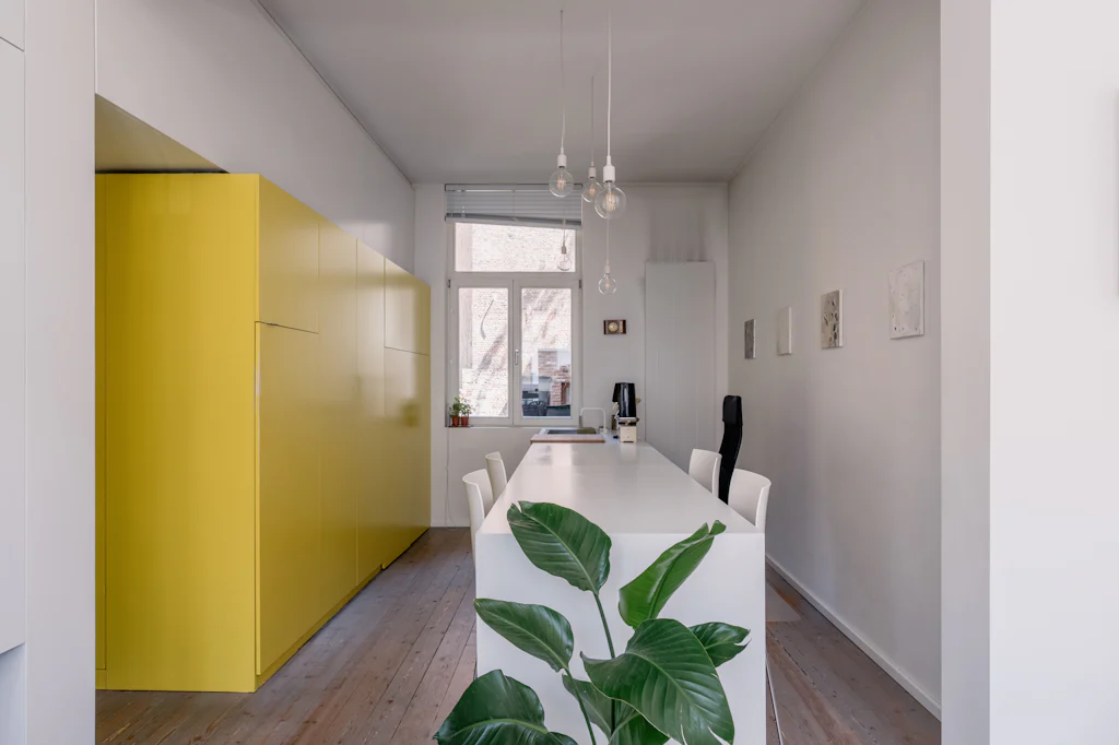 Een eclectisch gebouw uit 1911 met een mooie gevel in gele baksteen. Mogelijks was de kleur van die baksteen de inspiratie voor de interieurvormgever om het centrale volume in het appartement ook in die kleur uit te voeren. In balans met de witte muren en de houten vloer. Dat volume is niet alleen mooi maar ook functioneel en het leidt je vanuit de inkomhal naar de leefruimte. In de inkomhal doet het dienst als vestiaire, in de keuken zijn de kookplaat, de vaatwasmachine en de oven erin ondergebracht. Eenmaal de kastdeuren dicht zijn, is de keuken verstopt. En hocus pocus pilatus pas, komt een bureau tevoorschijn. Die zit verstopt in het werkblad van het keukeneiland. Heel cool én handig om aan het einde van de dag de werkplaats ook visueel af te sluiten en lekker te dineren op die plek. De kleur geel komt trouwens ook terug in de badkamer. Boven het toilet bevindt zich daar een raam met originele glas in lood tekening. Met 3 zonnenbloemen (wat een heerlijke optische geurverfrisser). Verder heeft de badkamer een inloopdouche, een lavabomeubel en een wasmachine. De gemene kosten bedragen 60 euro/maand en zijn een provisie voor het privéverbuik voor water.
