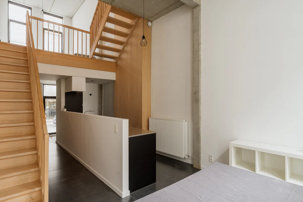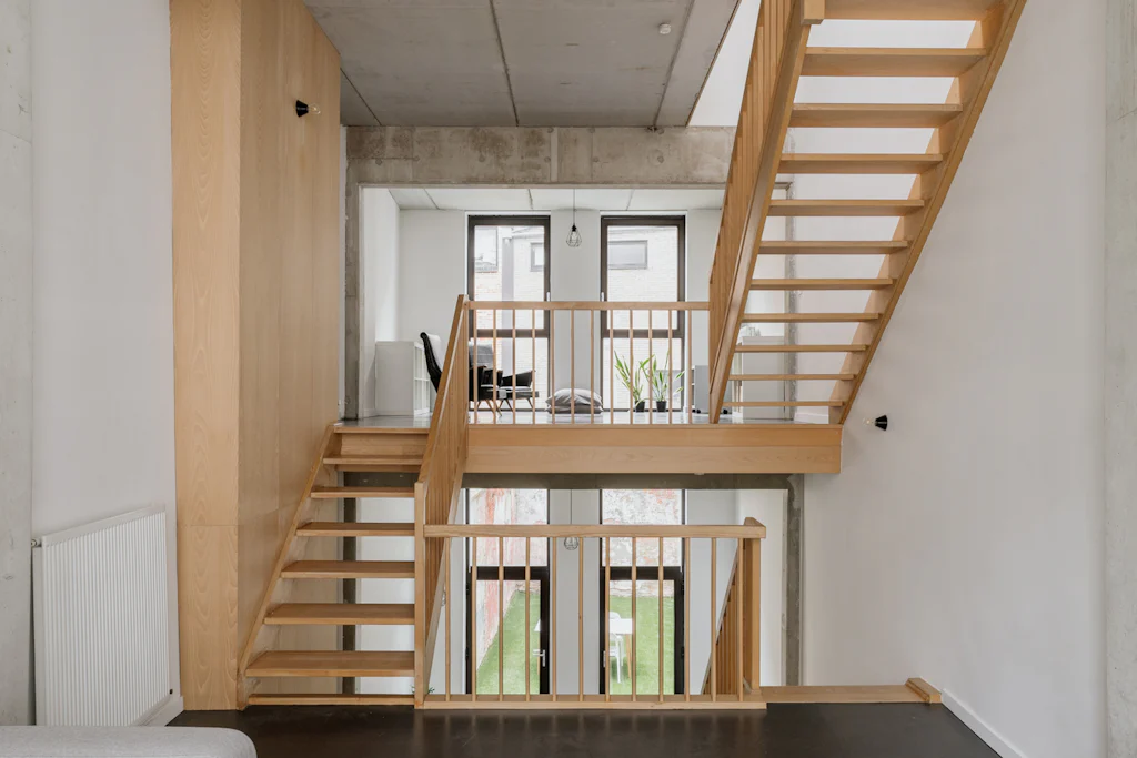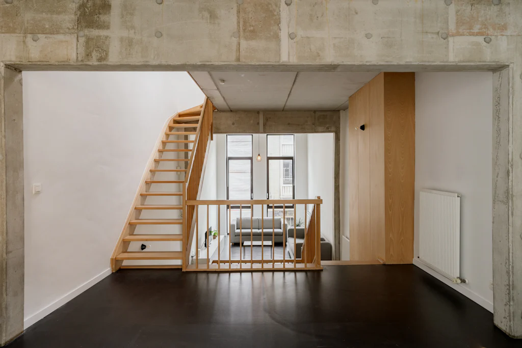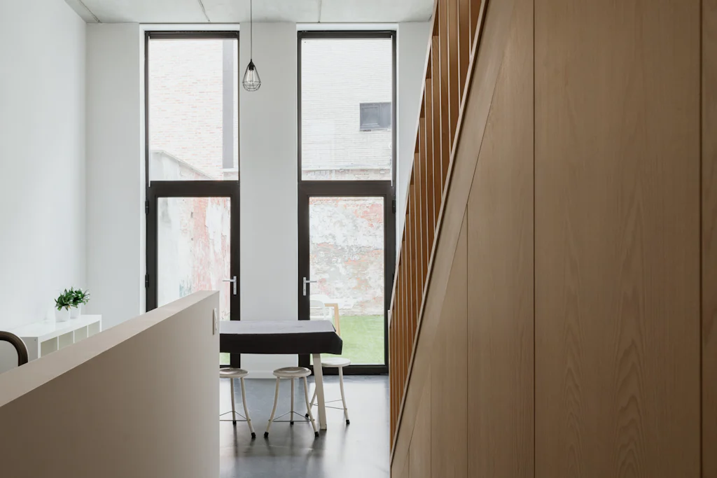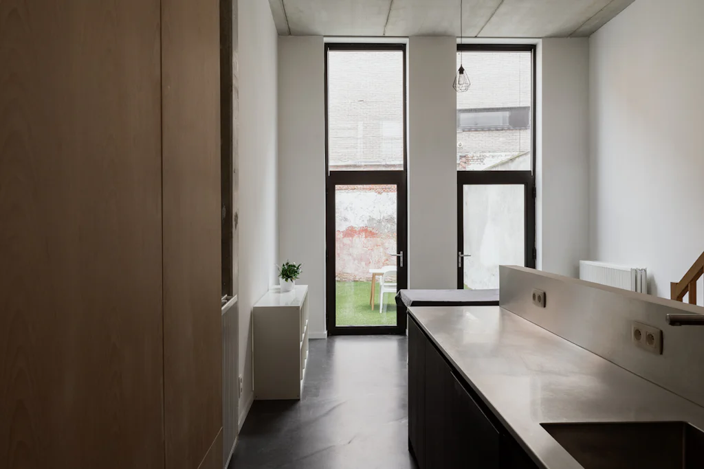 Na het bewonderen van de witte gevel in baksteen, heet een ruime inkomhal met vestiaire en gastentoilet je welkom. Ruim als in ‘er kunnen fietsen geplaatst worden’. Op het gelijkvloers heb je de keuken die volledig is uitgerust met kwalitatieve toestellen van Atag. Het keukenblad is uitgevoerd in inox. Dat materiaal is mooi in combinatie met het beukenhout van de trappen en de zichtbare structuur van het huis in beton. Terwijl je kookt, kan je letterlijk wegdromen naar de bovenste verdieping (alleen zien dat de biefstuk niet aanbrandt). Als je die trouwens liever op de barbecue bereidt, kan dat ook. In de stadstuin van 32 m². De leefruimte bevindt zich op de 1ste verdieping. Eigenlijk zijn er zelfs 2, want een aantal treden hoger heb je een extra ruimte die ingericht kan worden als home office of leeshoek. De 2 slaapkamers bevinden zich op de bovenste verdieping. Ze zijn allebei even groot en in beide kamers kan een tweepersoonsbed gesplaats worden. De badkamer heeft 2 lavabo’s, een ligbad met douchemogelijkheid en een toilet. De was- en droogmachine plaats je in de berging die naast de badkamer ligt.