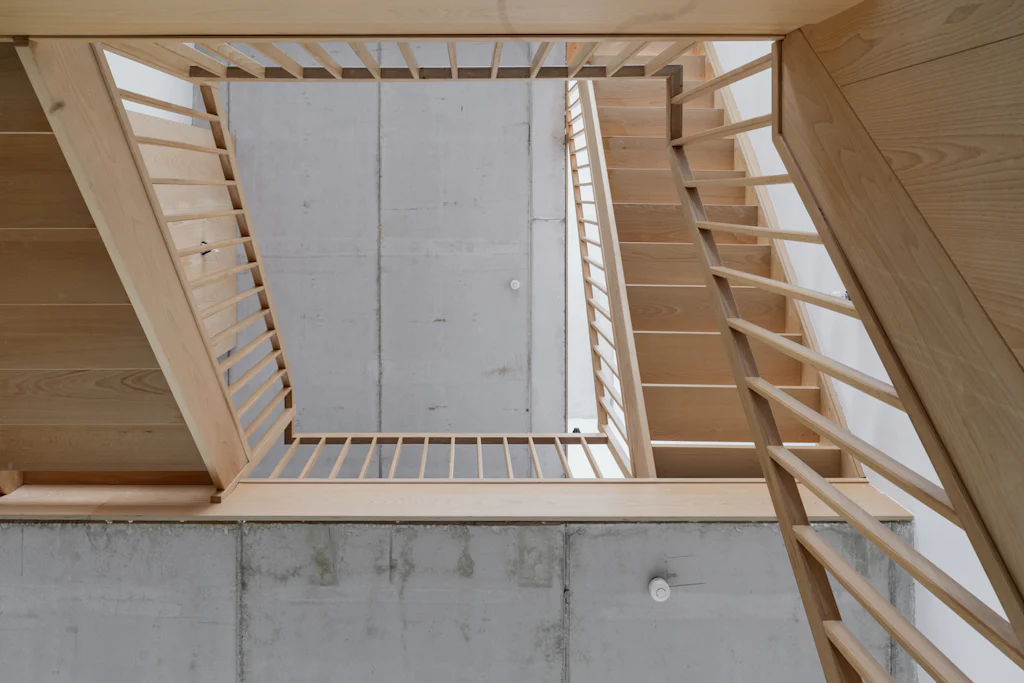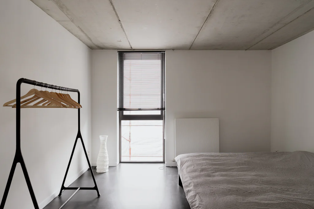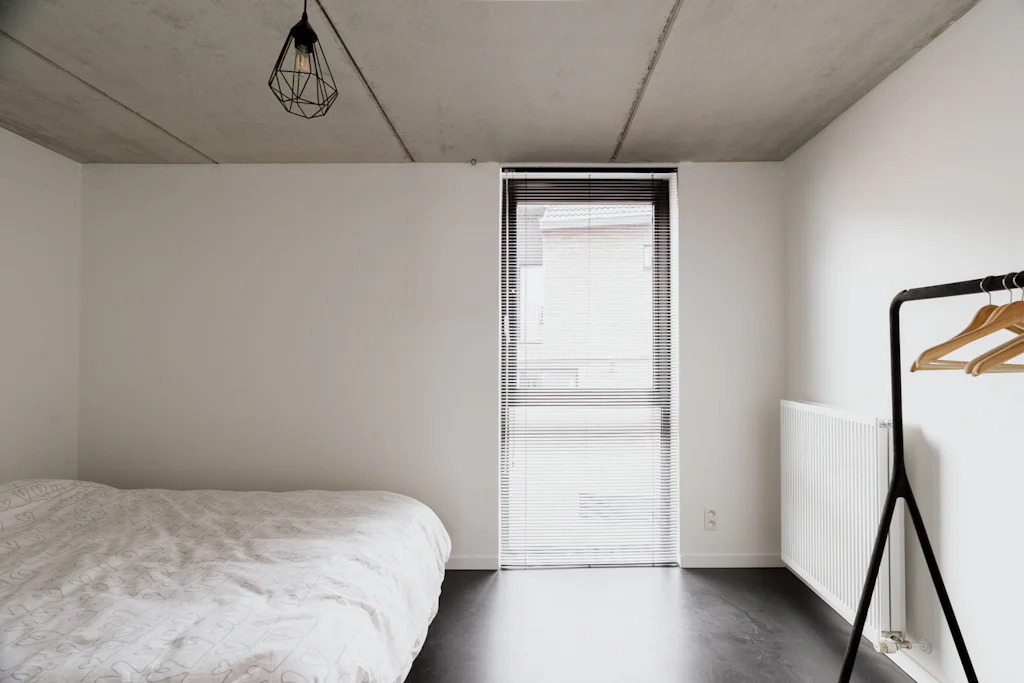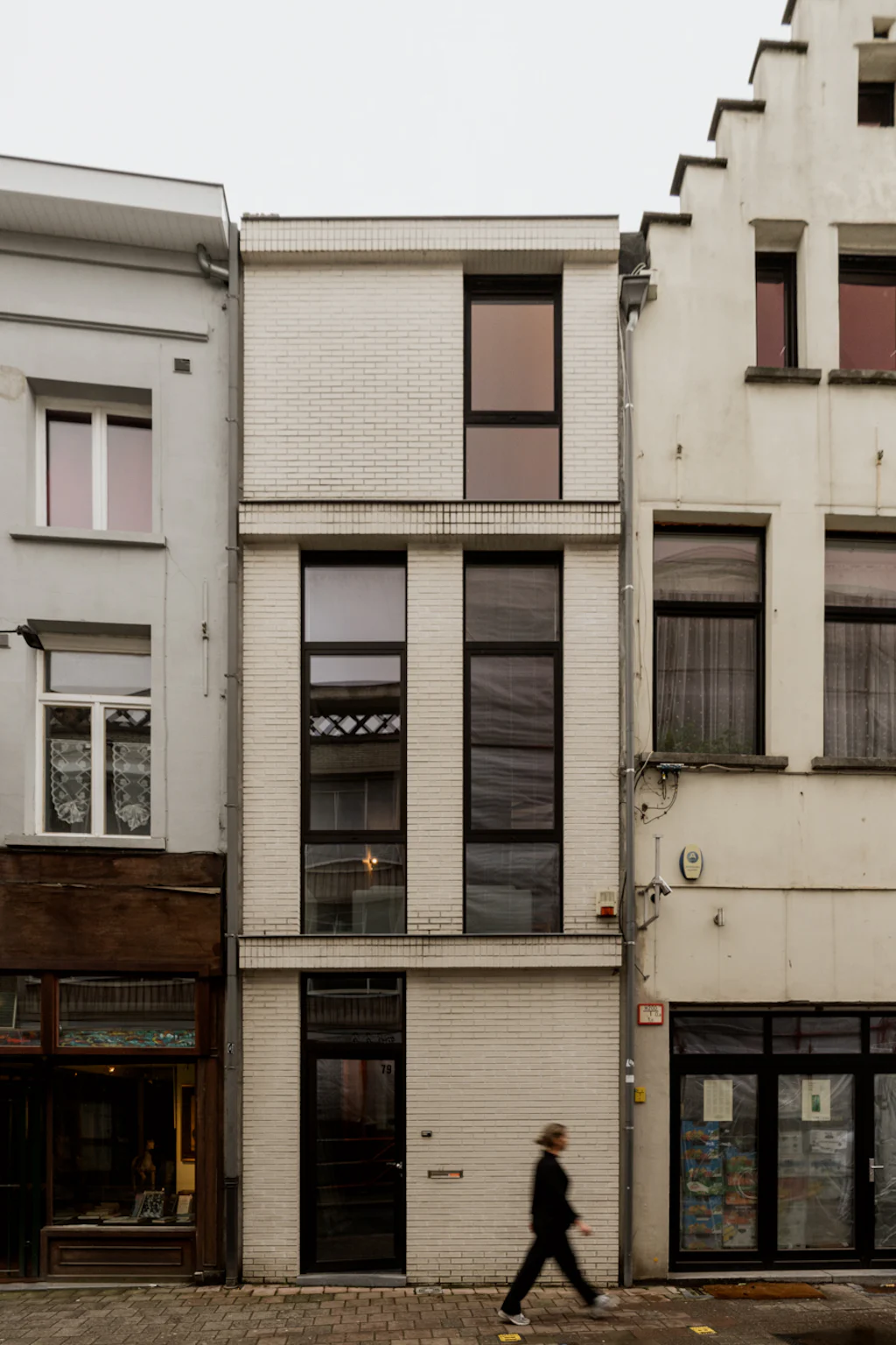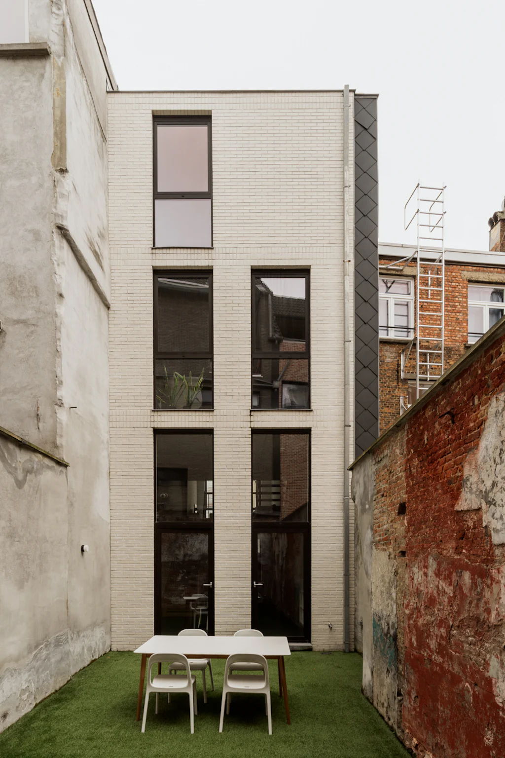 Na het bewonderen van de witte gevel in baksteen, heet een ruime inkomhal met vestiaire en gastentoilet je welkom. Ruim als in ‘er kunnen fietsen geplaatst worden’. Op het gelijkvloers heb je de keuken die volledig is uitgerust met kwalitatieve toestellen van Atag. Het keukenblad is uitgevoerd in inox. Dat materiaal is mooi in combinatie met het beukenhout van de trappen en de zichtbare structuur van het huis in beton. Terwijl je kookt, kan je letterlijk wegdromen naar de bovenste verdieping (alleen zien dat de biefstuk niet aanbrandt). Als je die trouwens liever op de barbecue bereidt, kan dat ook. In de stadstuin van 32 m². De leefruimte bevindt zich op de 1ste verdieping. Eigenlijk zijn er zelfs 2, want een aantal treden hoger heb je een extra ruimte die ingericht kan worden als home office of leeshoek. De 2 slaapkamers bevinden zich op de bovenste verdieping. Ze zijn allebei even groot en in beide kamers kan een tweepersoonsbed gesplaats worden. De badkamer heeft 2 lavabo’s, een ligbad met douchemogelijkheid en een toilet. De was- en droogmachine plaats je in de berging die naast de badkamer ligt.